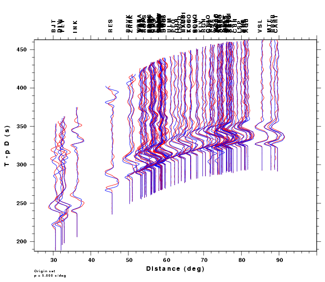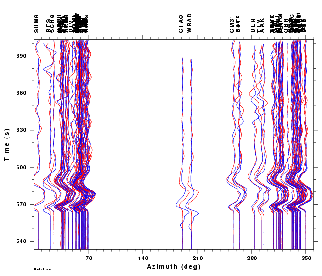 | Comparison of the observed traces (red) and solution predicted traces (blue) as a function of source to station azimuth in degrees (D). The purpose of this display is to highlight the azimuthal dependence on the first motion. The traces are annotated with the station name at the top. |