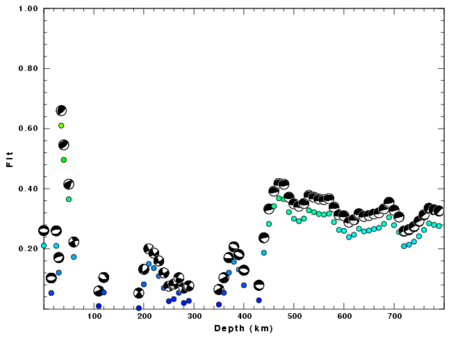 | Goodness of fit as a function of source depth. The measure is 1 - SUM (o -p)2 / SUM o2. A value of 1.0 is the best fit. The best double couple mechanism for the solution depth is plotted above goodness of fit value to indicate how the mefhanism may change with depth. |