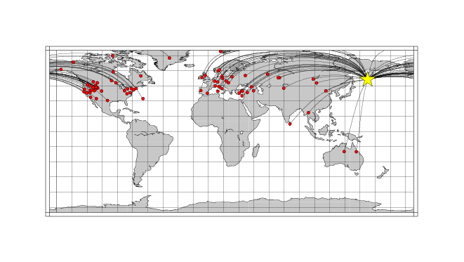 Location of the earthquake (yellow star) and great circle path from the epicenter to each station (red) [created using GMT (Wessel, P., and W. H. F. Smith, New version of Generic Mapping Tools released, EOS Trans. AGU, 76 329, 1995.)] |