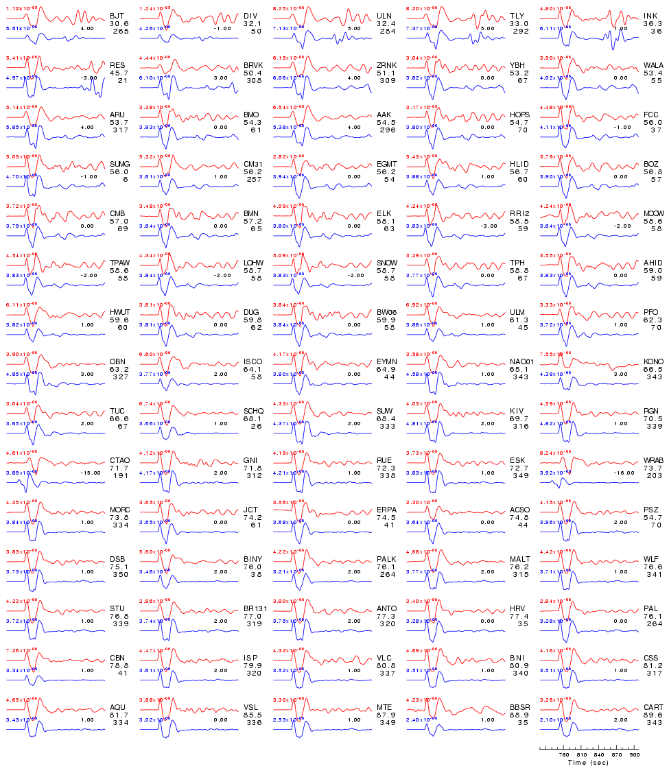 | Comparison of the observed traces (red) and solution predicted traces (blue) ordered in terms of increasing epicentral distance. Each pair of traces is annotated with the station name, epicentral distance in degrees, source to station azimuth in degrees. Each pair of traces is plotted with the same scale and the peak amplitudes are indicated at the lect of each trace. Finally the time shift between the P-wave first arrival picked and the the theoretical P-wave first arrival in the predicted trace is indicated, with a positive sign indicating that the predicted trace has been shifted to the right by the given number of seconds. as a function of source to station azimuth in degrees (D). The purpose of this display is to highlight the azimuthal dependence on the first motion. The traces are annotated with the station name at the top. |