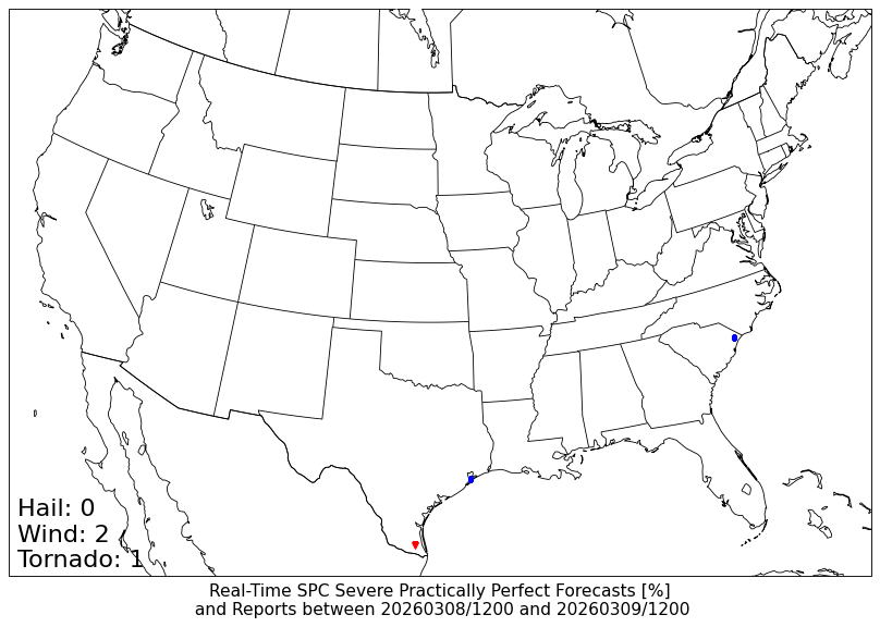 24-h SPC Storm Reports centered on 20260309/0000