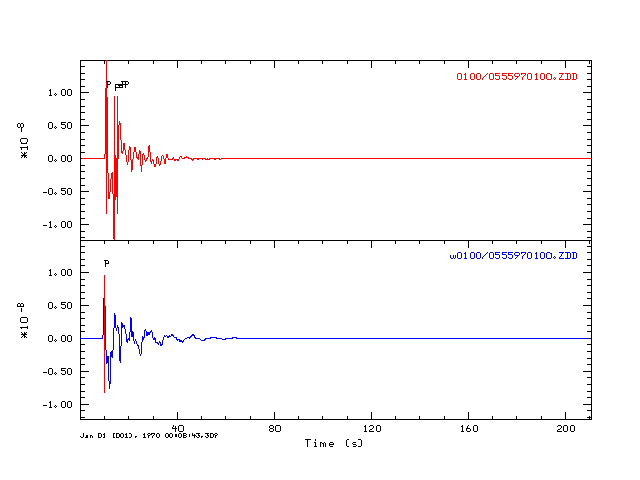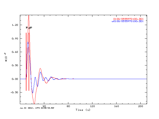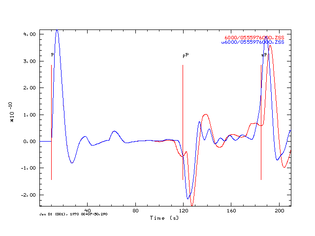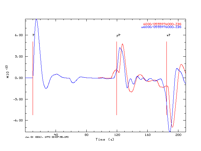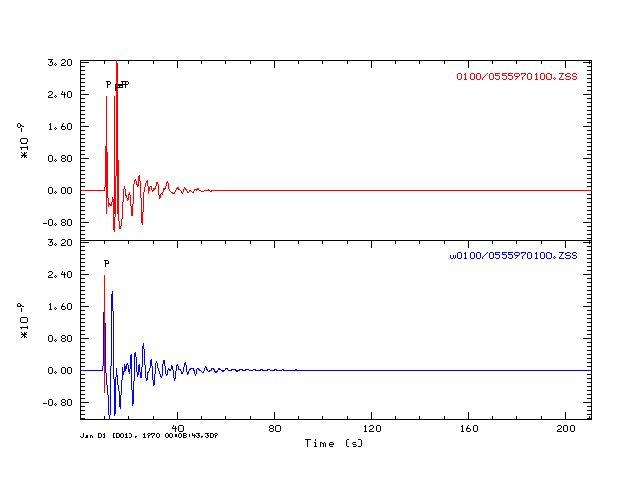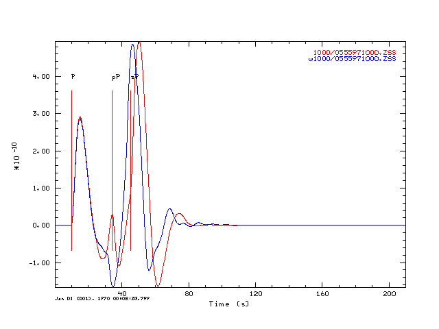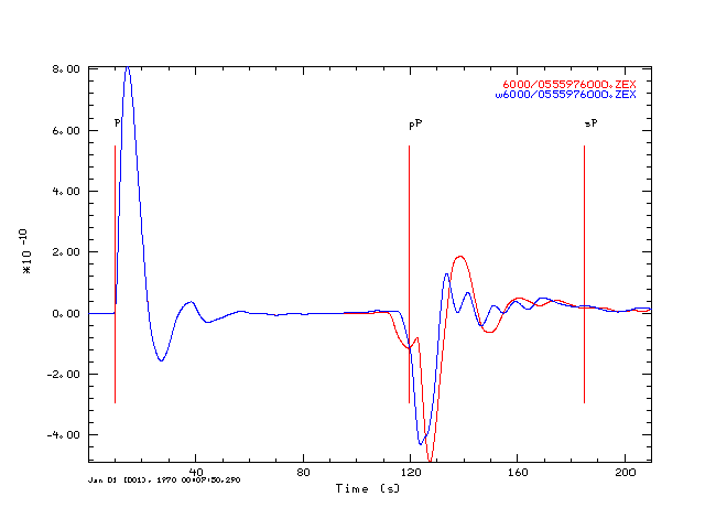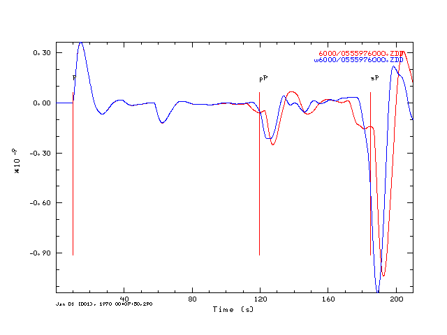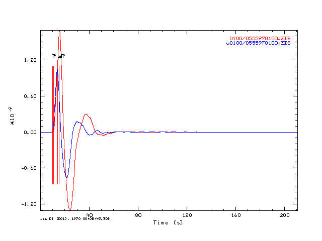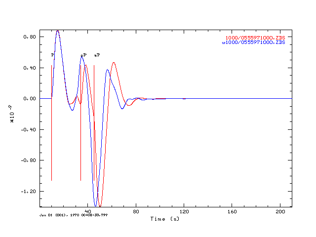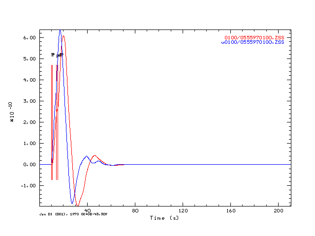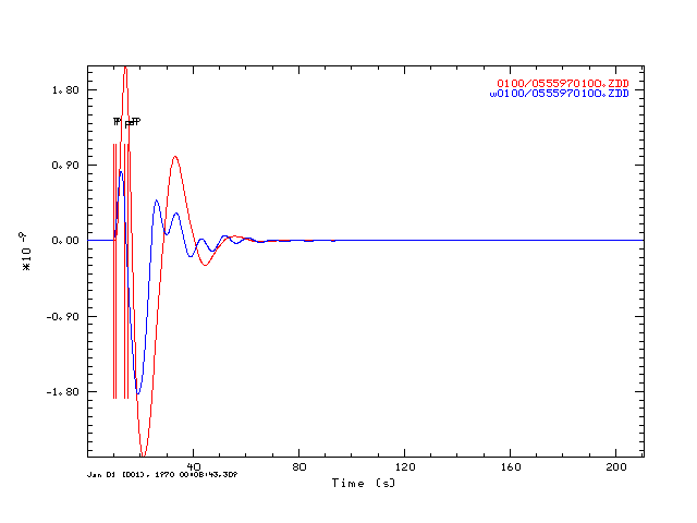 The second set of comparisons low pass filters the traces at a 0.05 Hz, and integrates, and plots them in an overlay to see the effect of the source model for teleseismic P-wave wave source inversion.