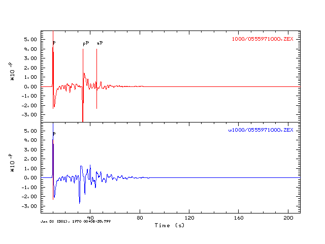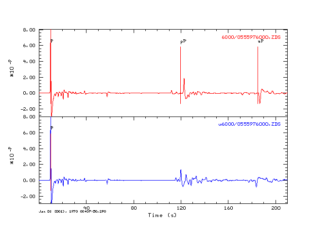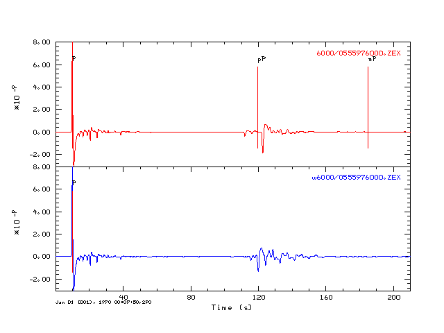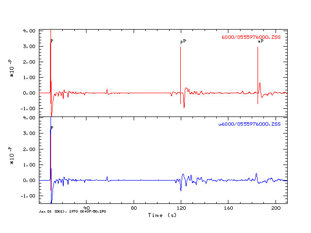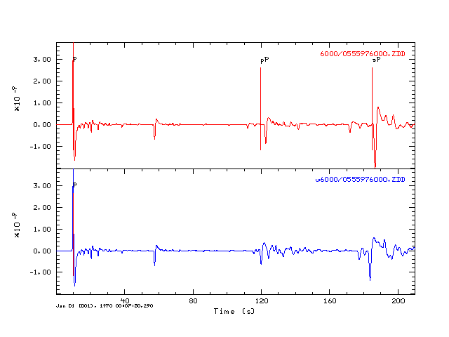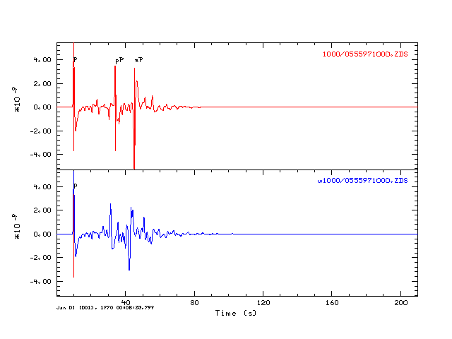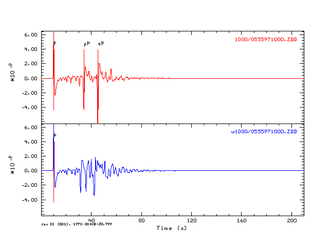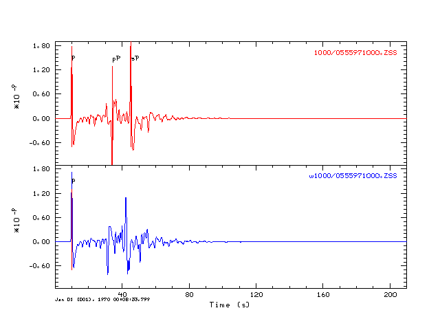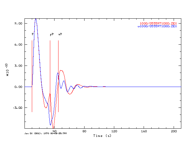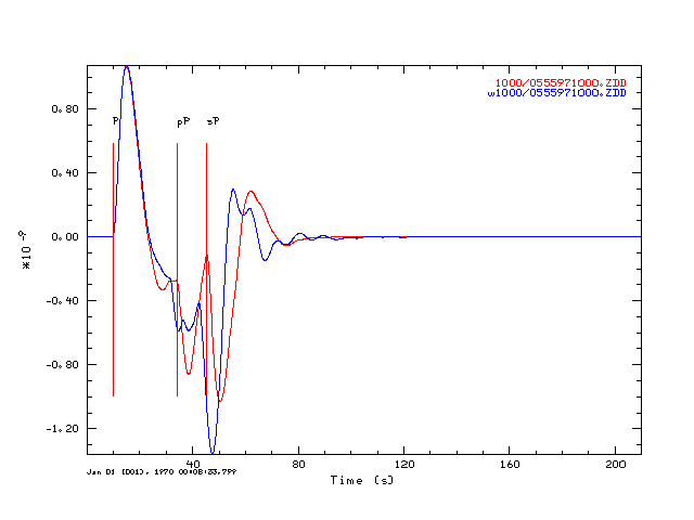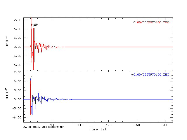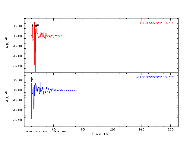 The second set of comparisons low pass filters the traces at a 0.05 Hz, and integrates, and plots them in an overlay to see the effect of the source model for teleseismic P-wave wave source inversion.