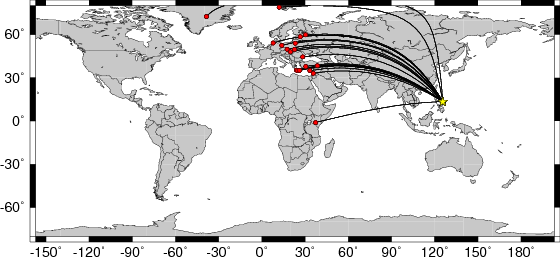 Location of the earthquake (yellow star) and great circle path from the epicenter to each station (red) [created using GMT (Wessel, P., and W. H. F. Smith, New version of Generic Mapping Tools released, EOS Trans. AGU, 76 329, 1995.)] |