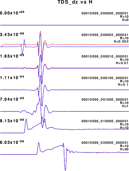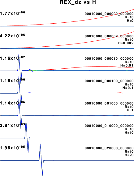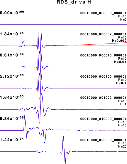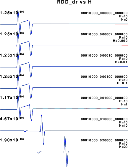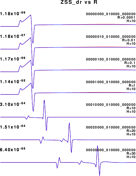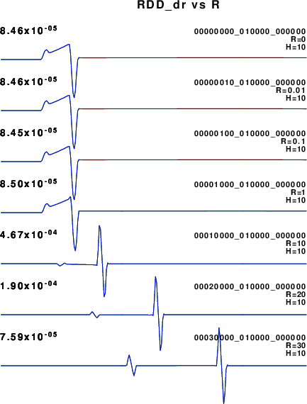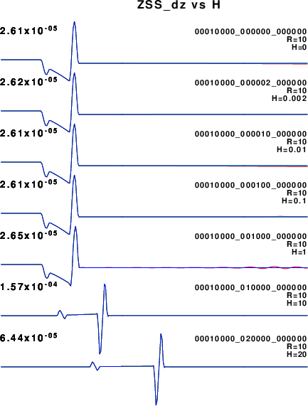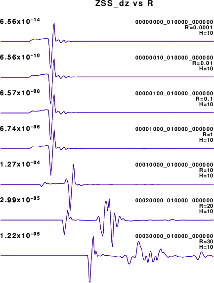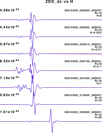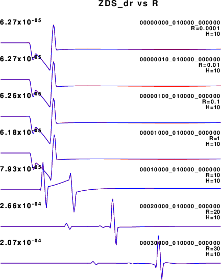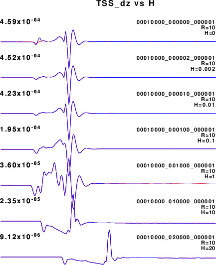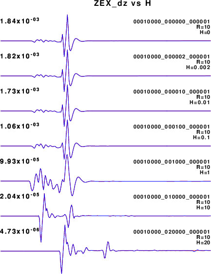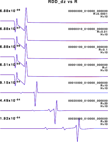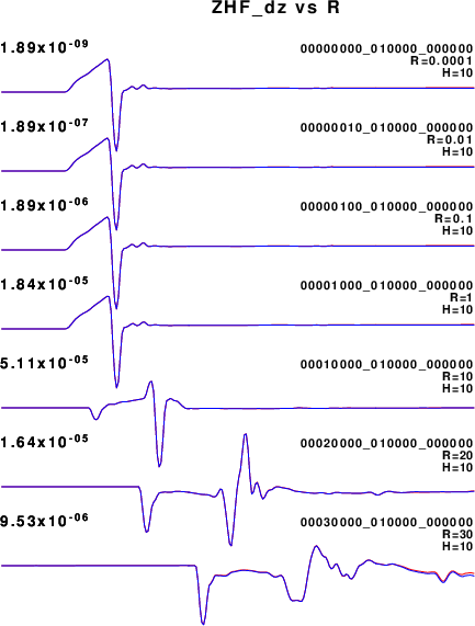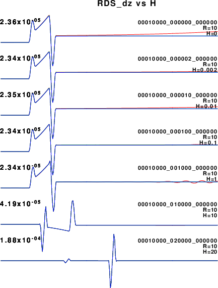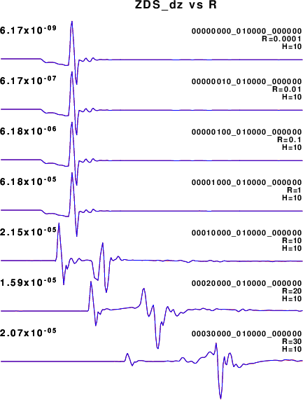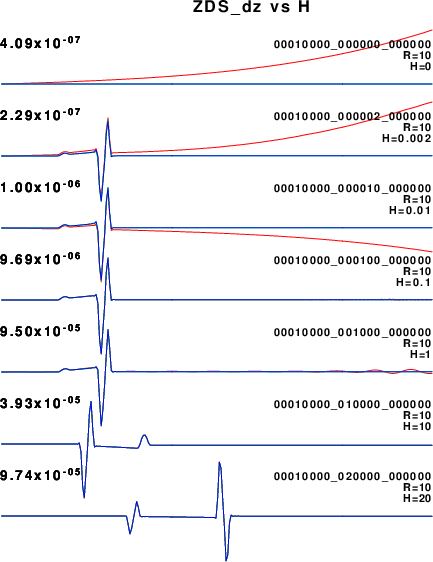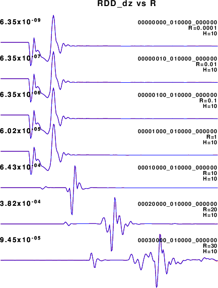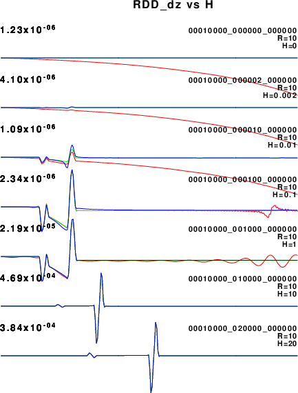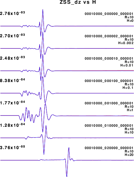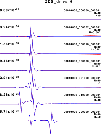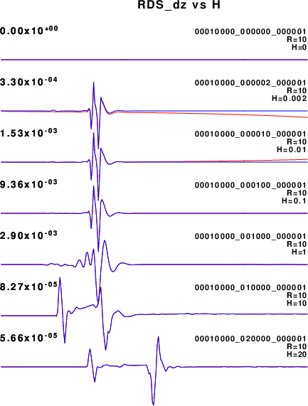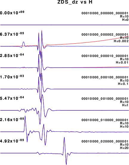 However larger differences are seen for fixed R=10 km as the source depth approaches the receiver depth. The hspec96strain (red curves) is supposed to be zero at H=0 for RDS, TDS, RVF, ZDD, ZEX, ZHF and REX. In most cases the true amplitude may be zero, and the difference reflects numerical error. There are bigger differences in the d/dz of RDD, REX, RHF, RSS, THF, TSS, ZDS. The d/dr of RDS and ZEX show differences.