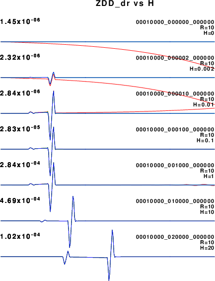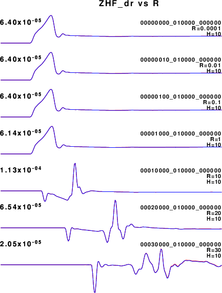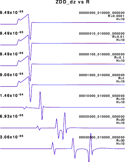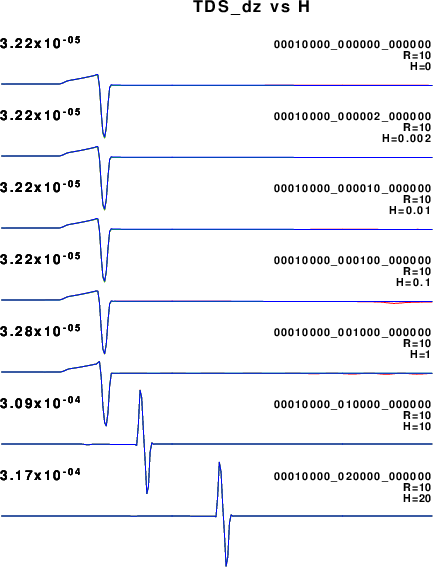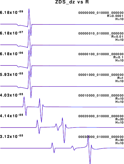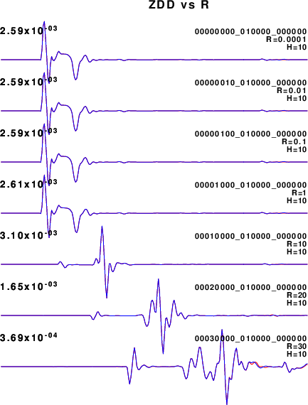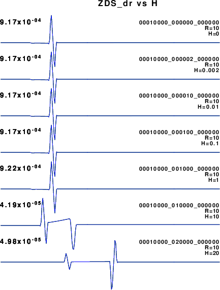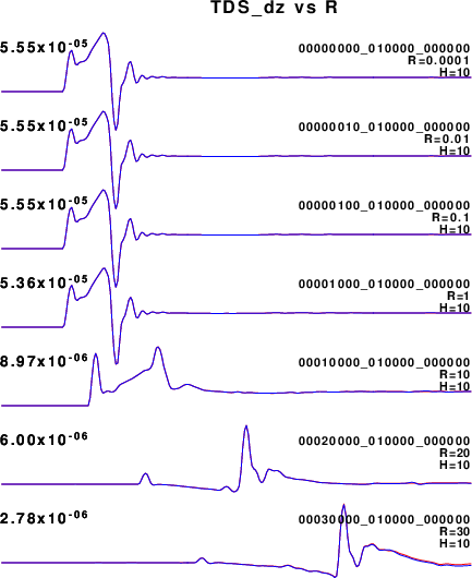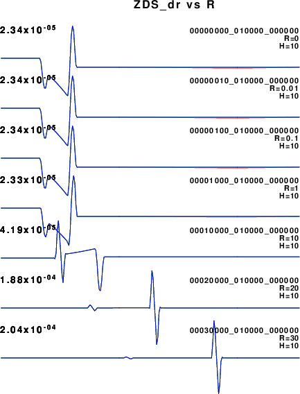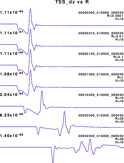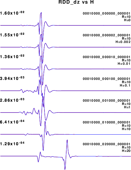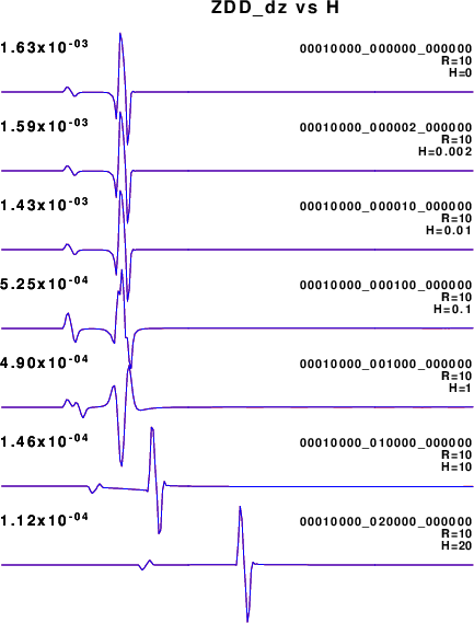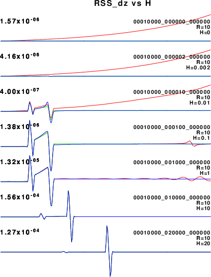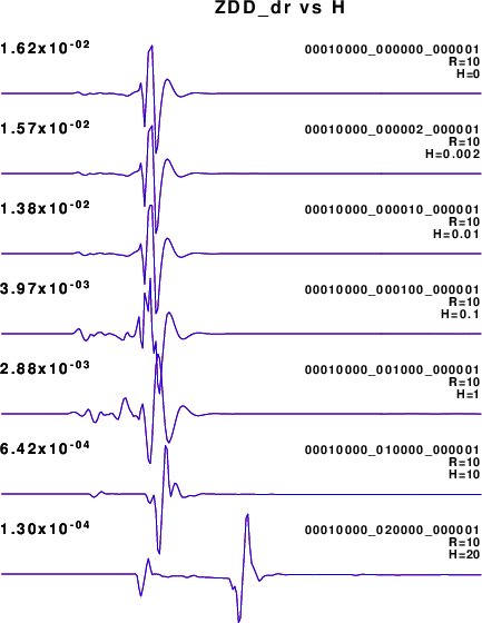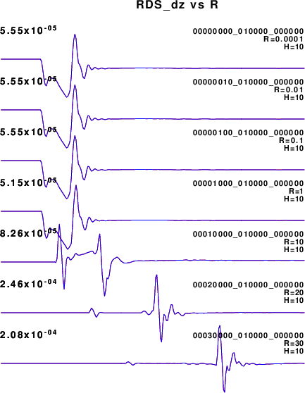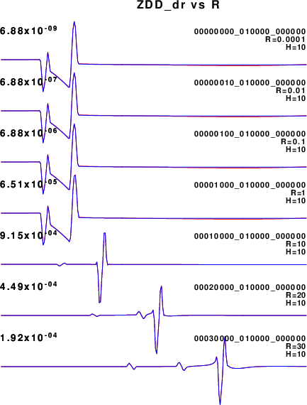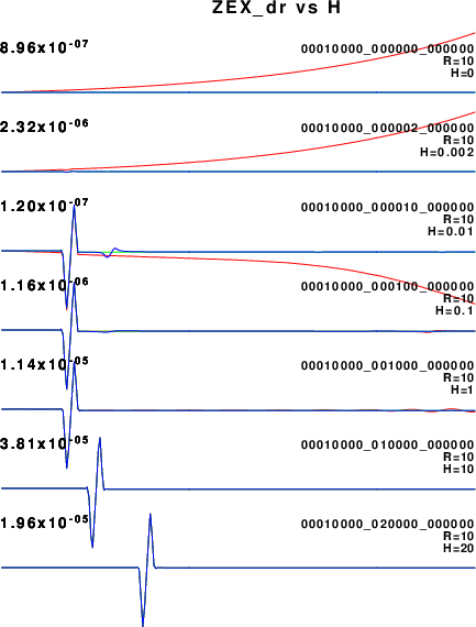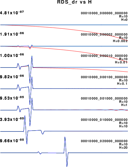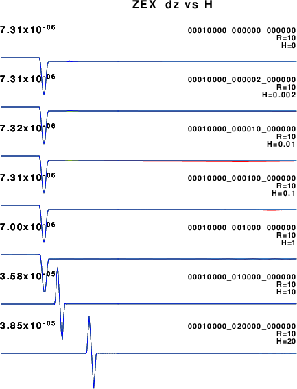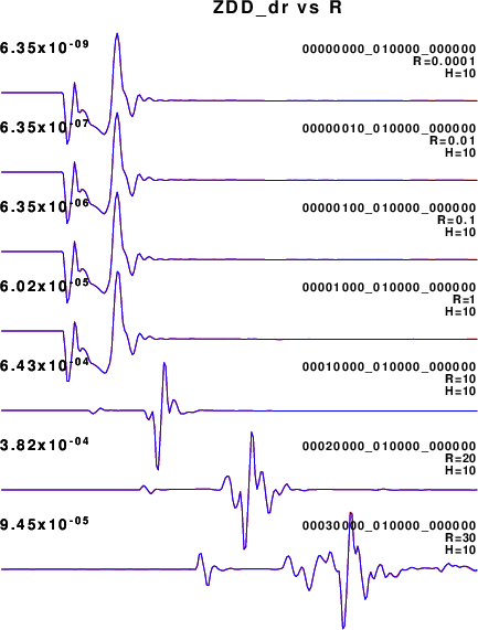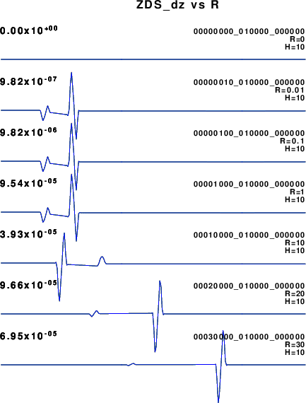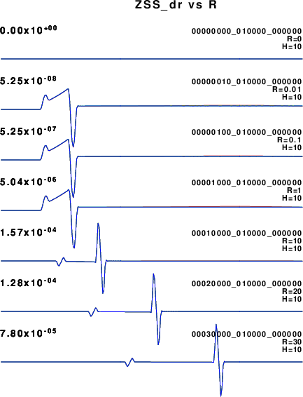 However larger differences are seen for fixed R=10 km as the source depth approaches the receiver depth. The hspec96strain (red curves) is supposed to be zero at H=0 for RDS, TDS, RVF, ZDD, ZEX, ZHF and REX. In most cases the true amplitude may be zero, and the difference reflects numerical error. There are bigger differences in the d/dz of RDD, REX, RHF, RSS, THF, TSS, ZDS. The d/dr of RDS and ZEX show differences.