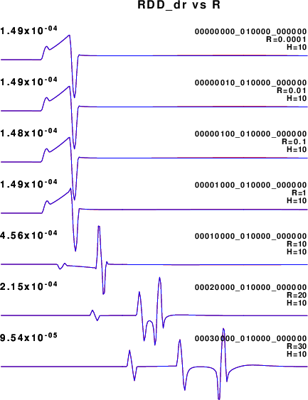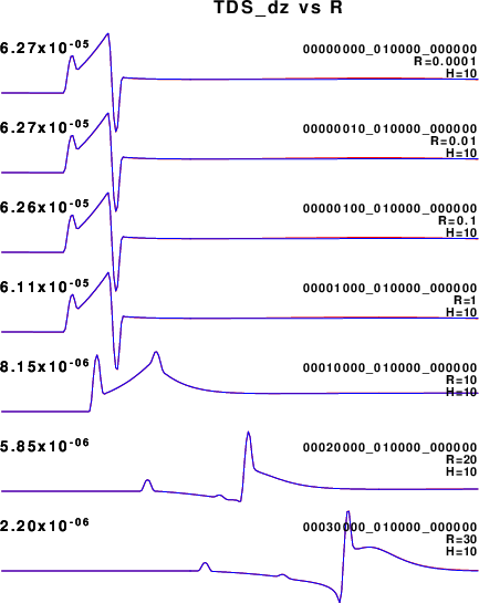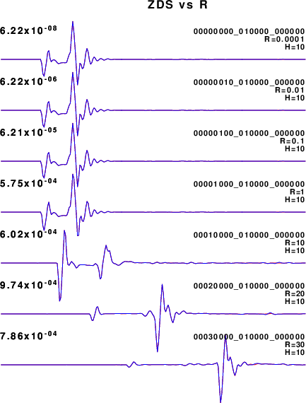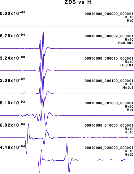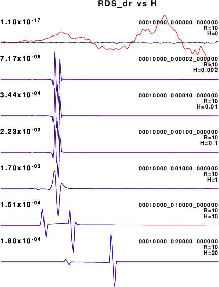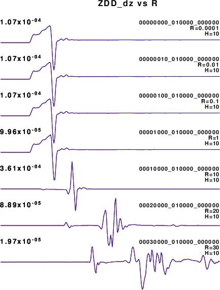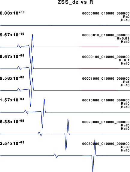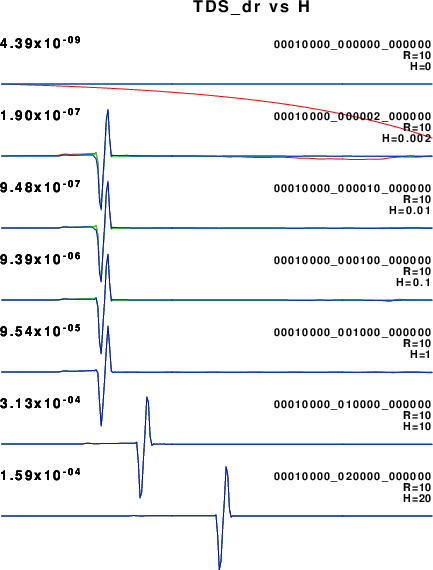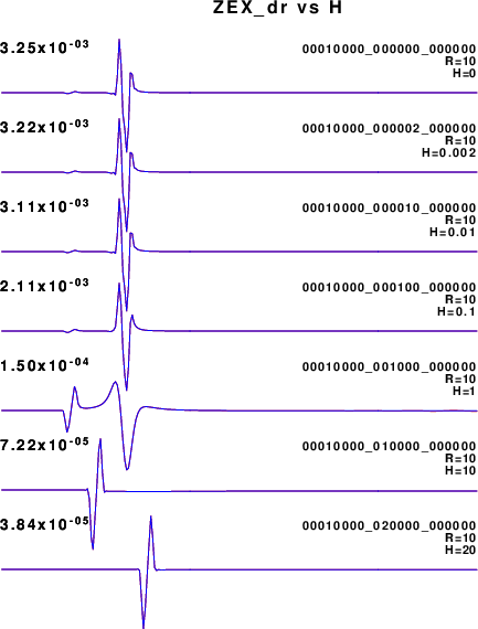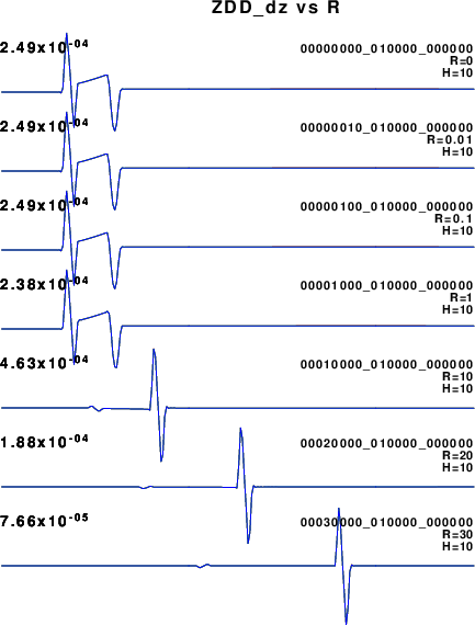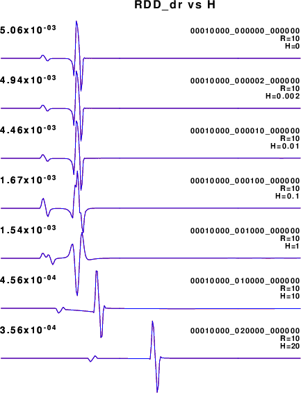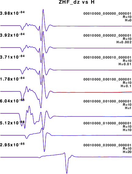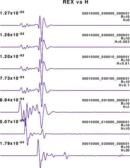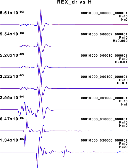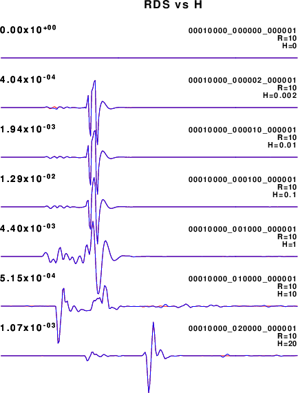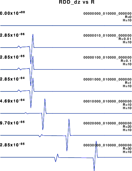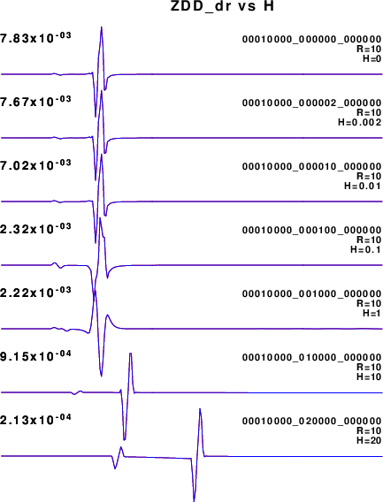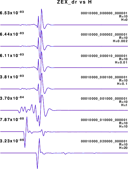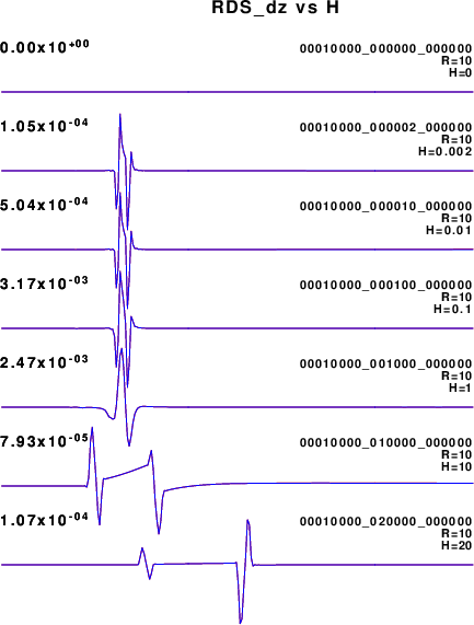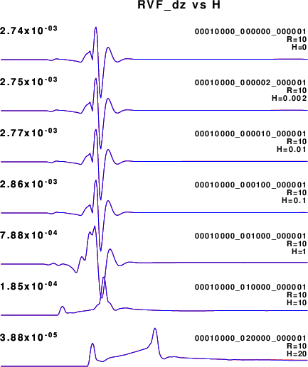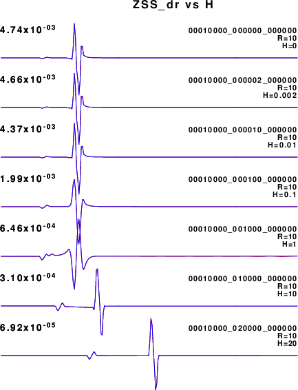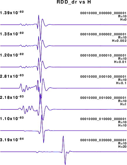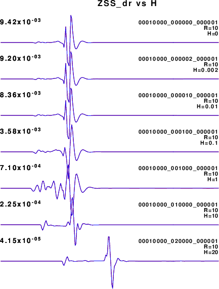 However larger differences are seen for fixed R=10 km as the source depth approaches the receiver depth. The hspec96strain (red curves) is supposed to be zero at H=0 for RDS, TDS, RVF, ZDD, ZEX, ZHF and REX. In most cases the true amplitude may be zero, and the difference reflects numerical error. There are bigger differences in the d/dz of RDD, REX, RHF, RSS, THF, TSS, ZDS. The d/dr of RDS and ZEX show differences.