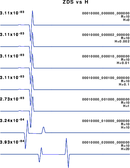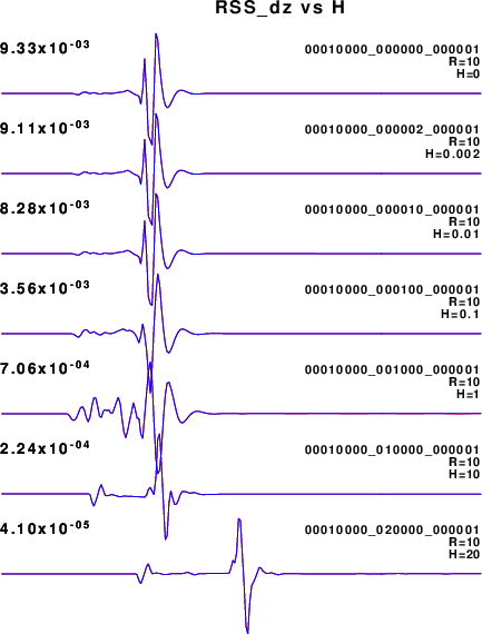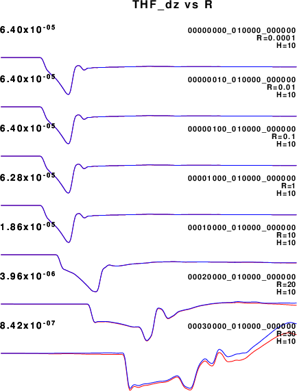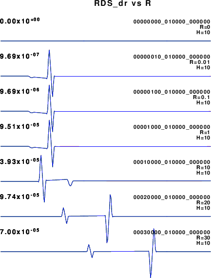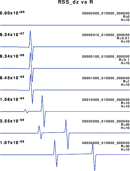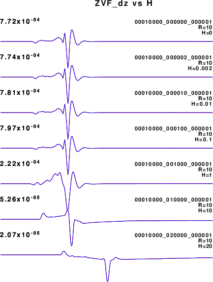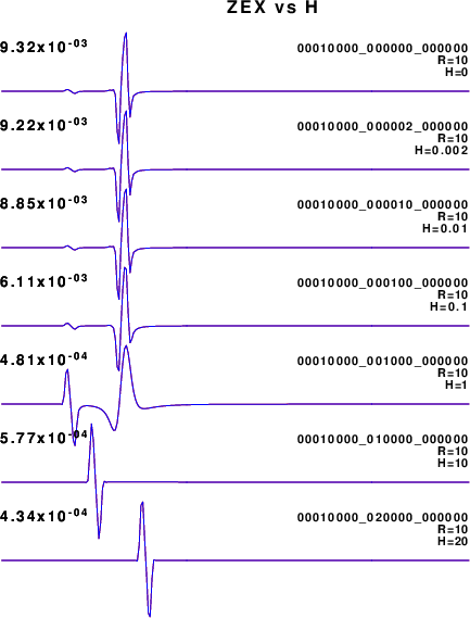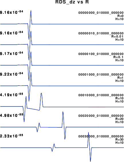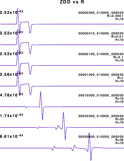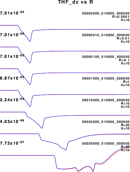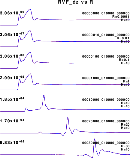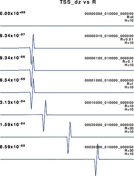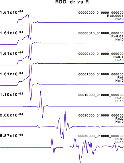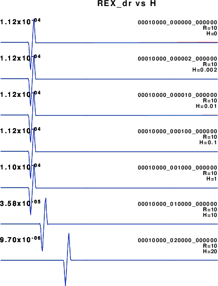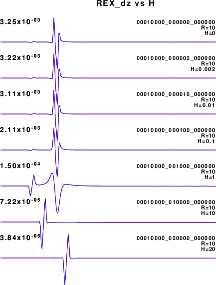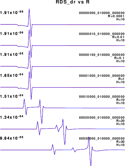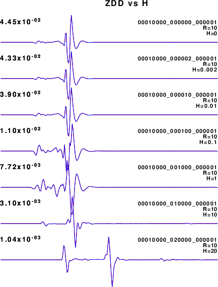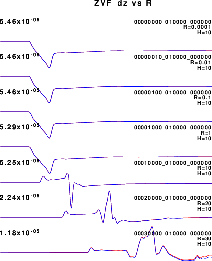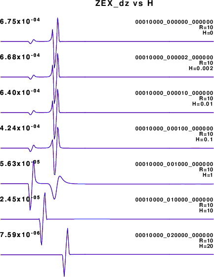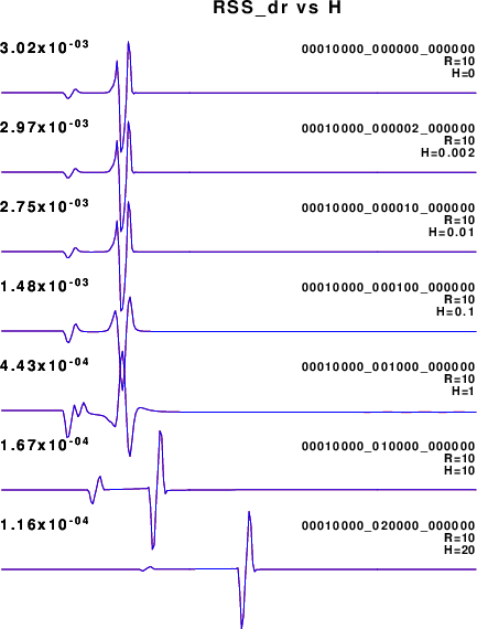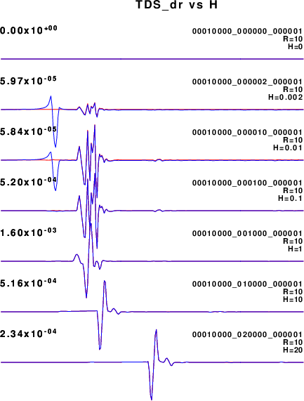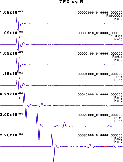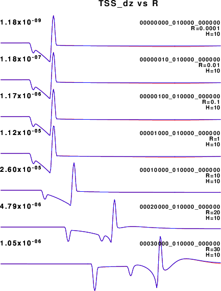 However larger differences are seen for fixed R=10 km as the source depth approaches the receiver depth. The hspec96strain (red curves) is supposed to be zero at H=0 for RDS, TDS, RVF, ZDD, ZEX, ZHF and REX. In most cases the true amplitude may be zero, and the difference reflects numerical error. There are bigger differences in the d/dz of RDD, REX, RHF, RSS, THF, TSS, ZDS. The d/dr of RDS and ZEX show differences.