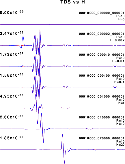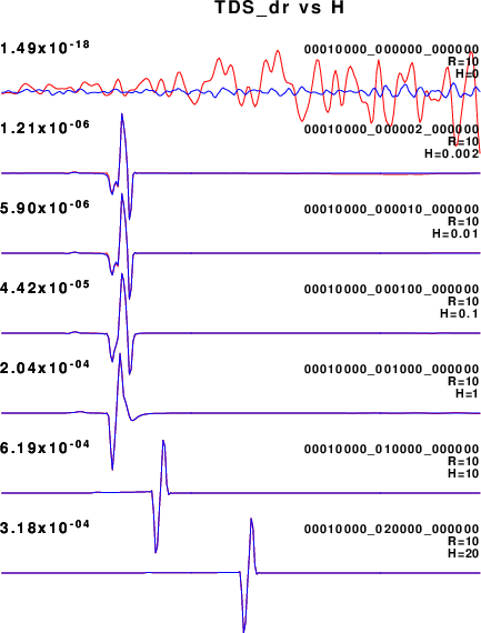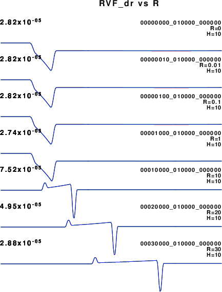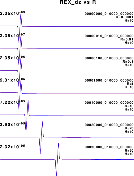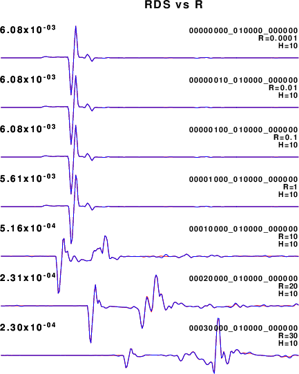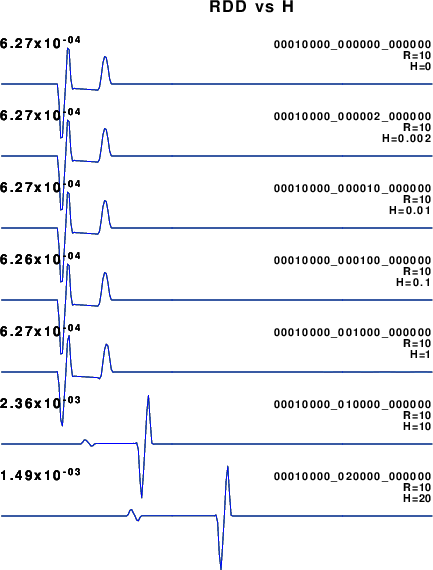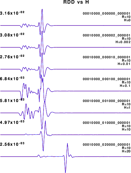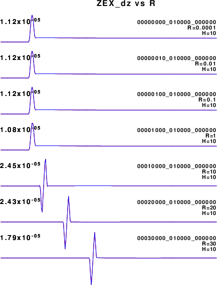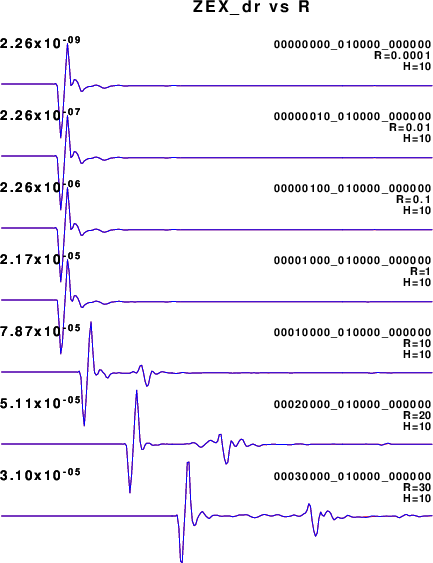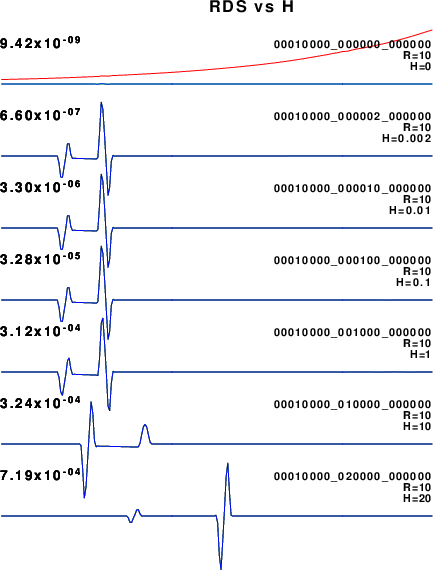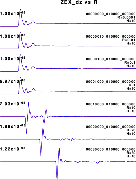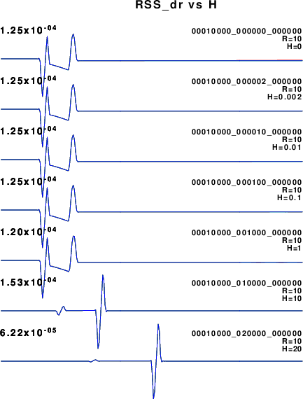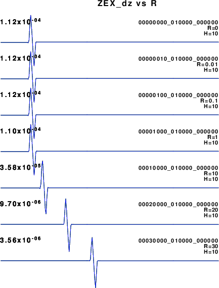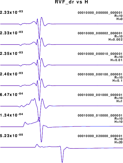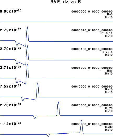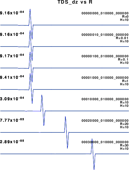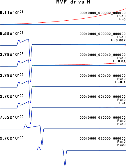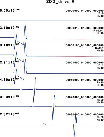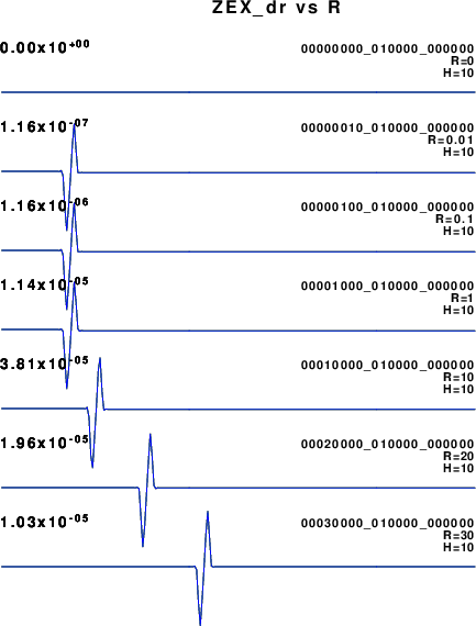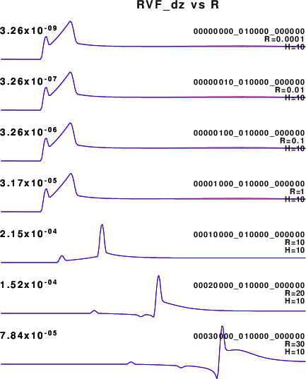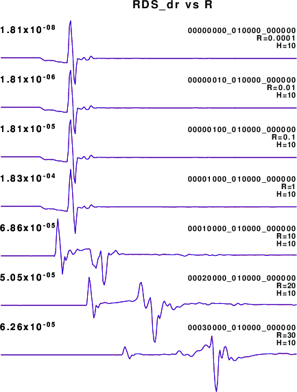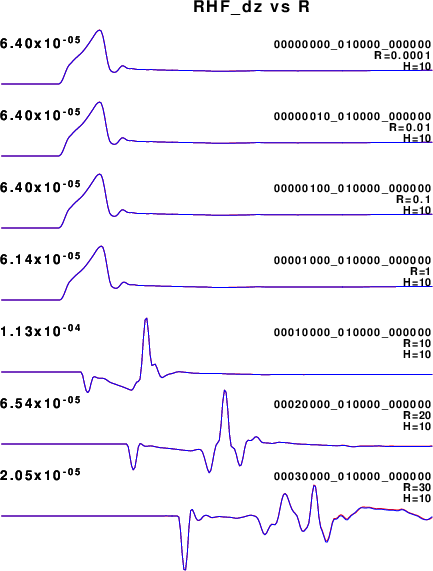 However larger differences are seen for fixed R=10 km as the source depth approaches the receiver depth. The hspec96strain (red curves) is supposed to be zero at H=0 for RDS, TDS, RVF, ZDD, ZEX, ZHF and REX. In most cases the true amplitude may be zero, and the difference reflects numerical error. There are bigger differences in the d/dz of RDD, REX, RHF, RSS, THF, TSS, ZDS. The d/dr of RDS and ZEX show differences.