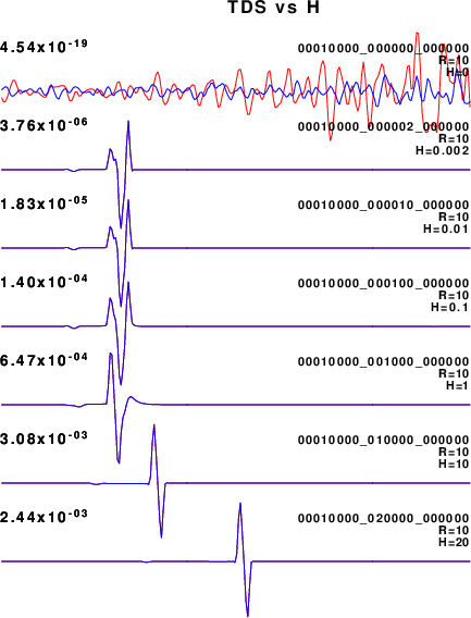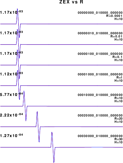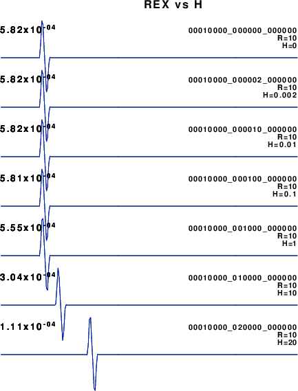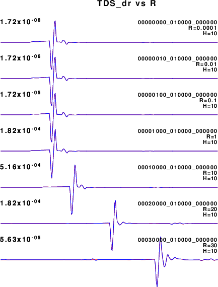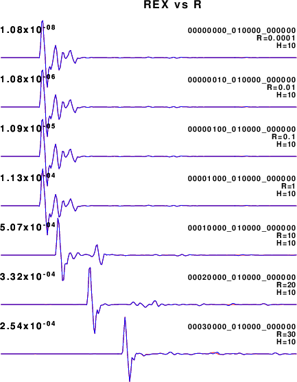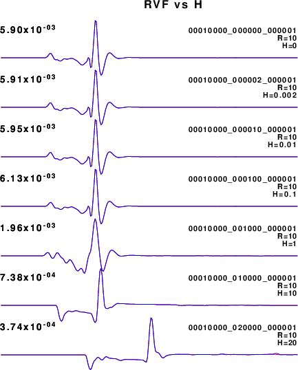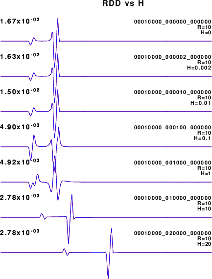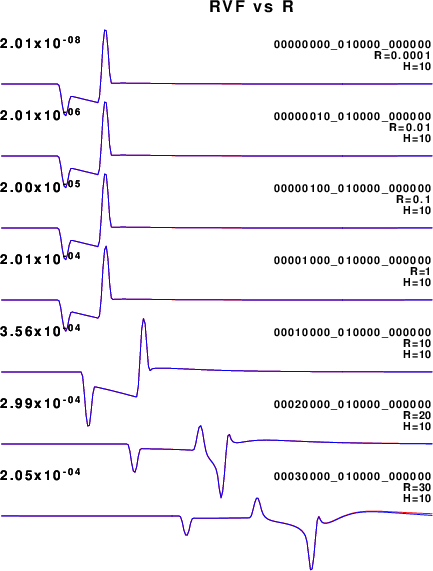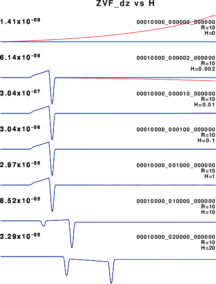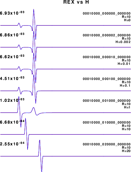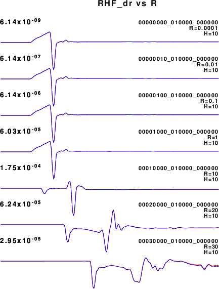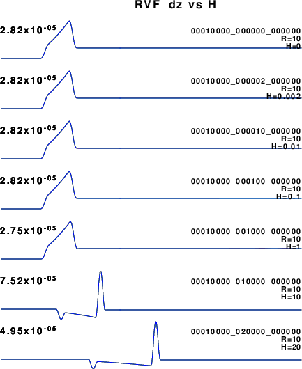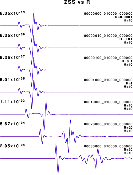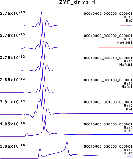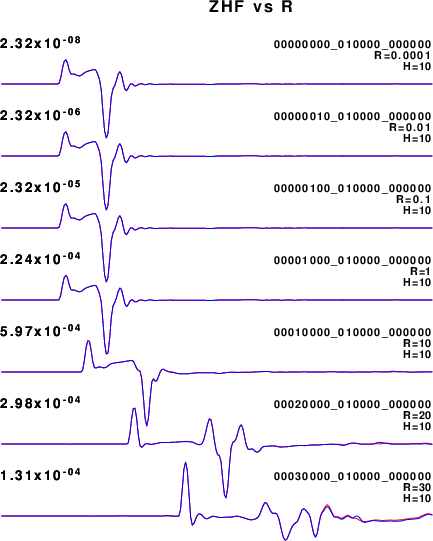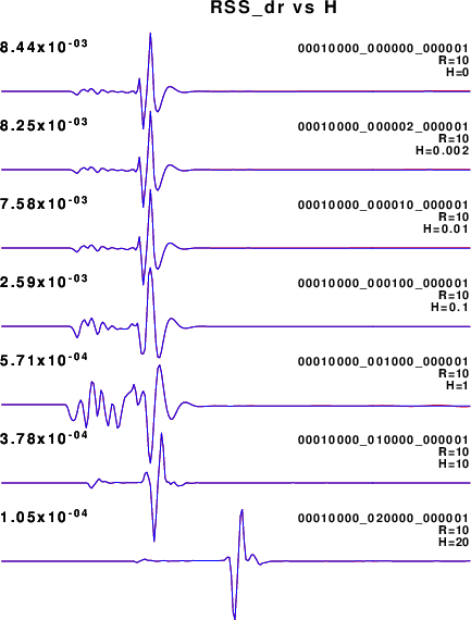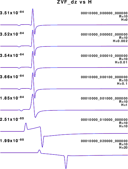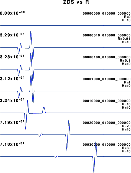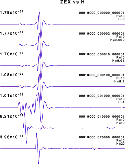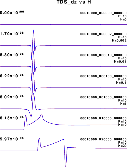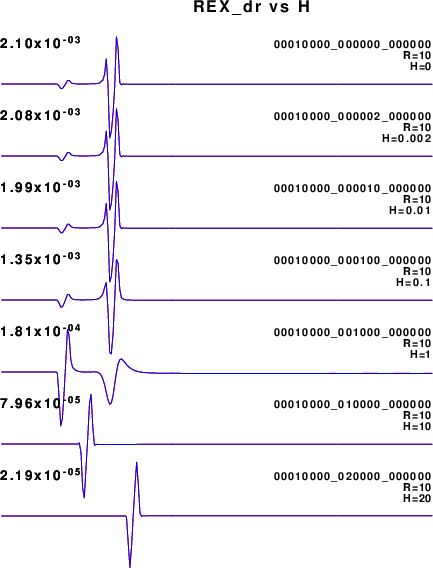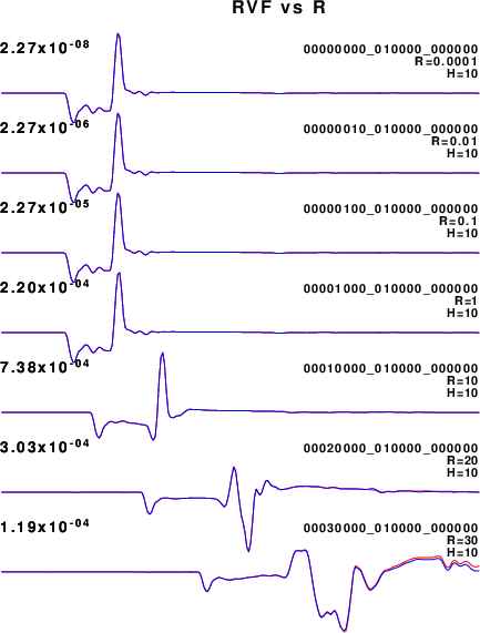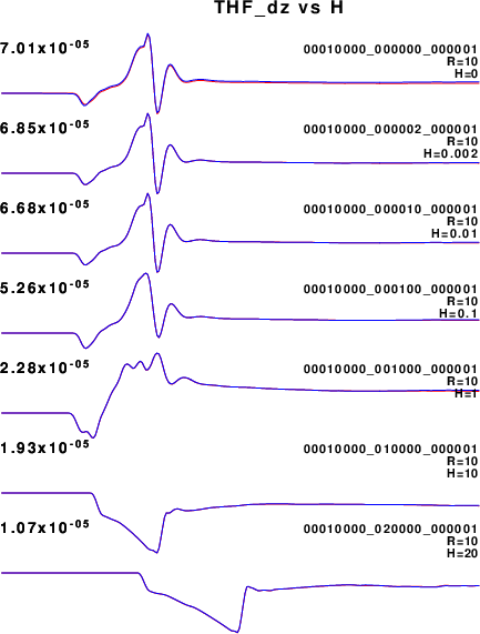 However larger differences are seen for fixed R=10 km as the source depth approaches the receiver depth. The hspec96strain (red curves) is supposed to be zero at H=0 for RDS, TDS, RVF, ZDD, ZEX, ZHF and REX. In most cases the true amplitude may be zero, and the difference reflects numerical error. There are bigger differences in the d/dz of RDD, REX, RHF, RSS, THF, TSS, ZDS. The d/dr of RDS and ZEX show differences.