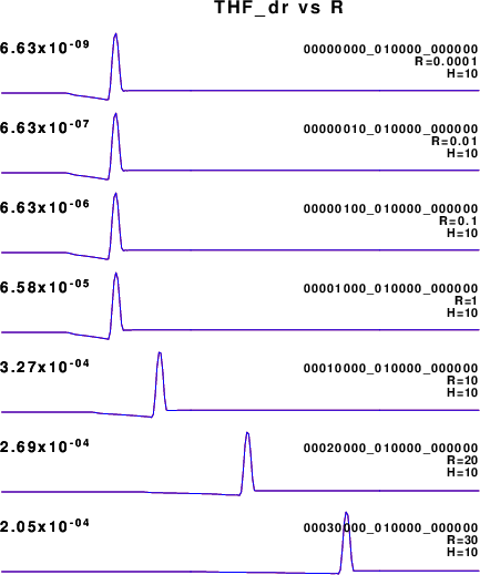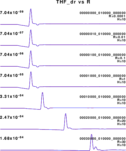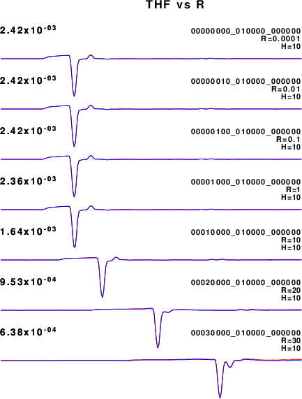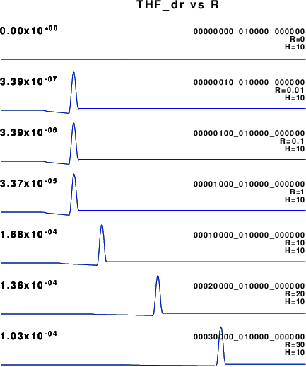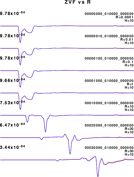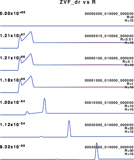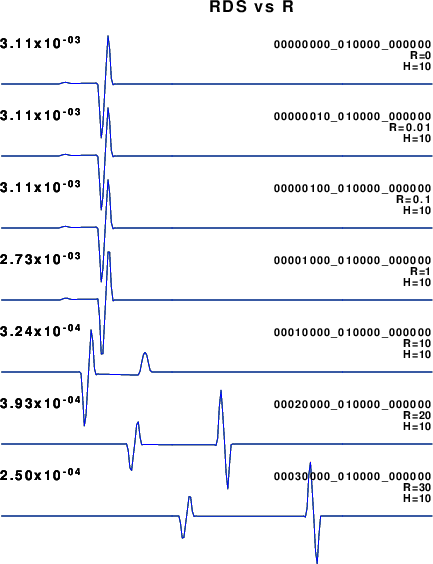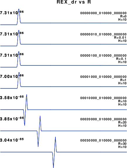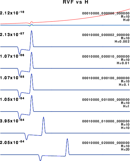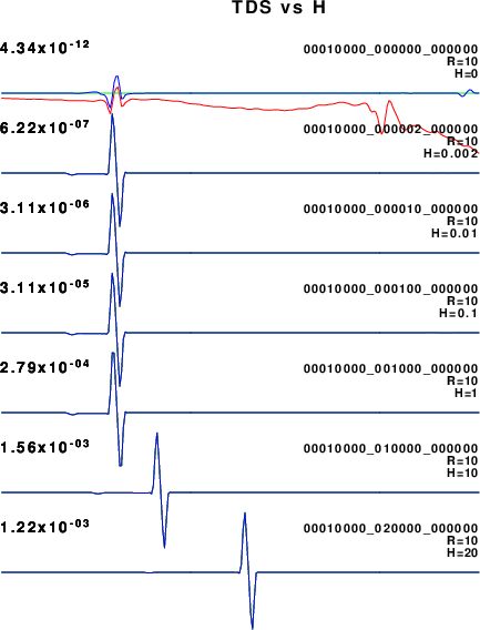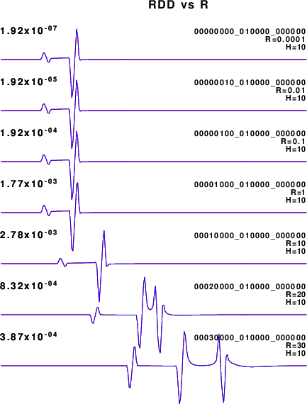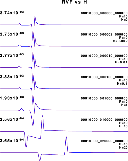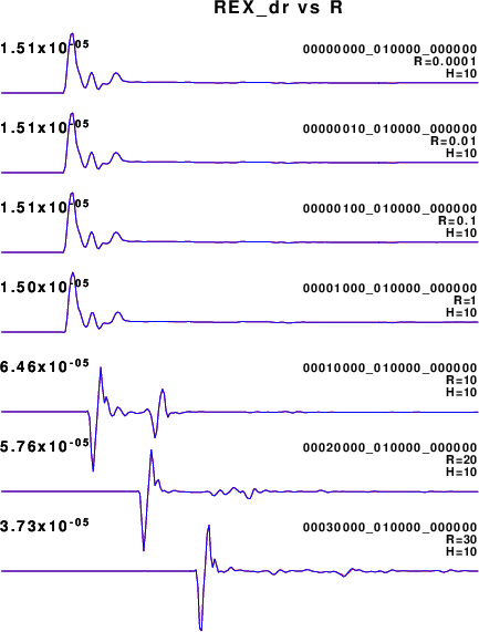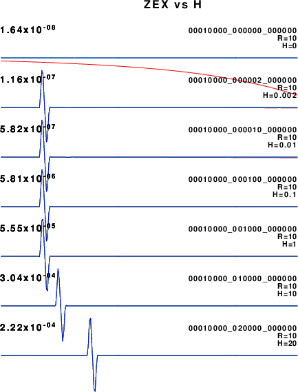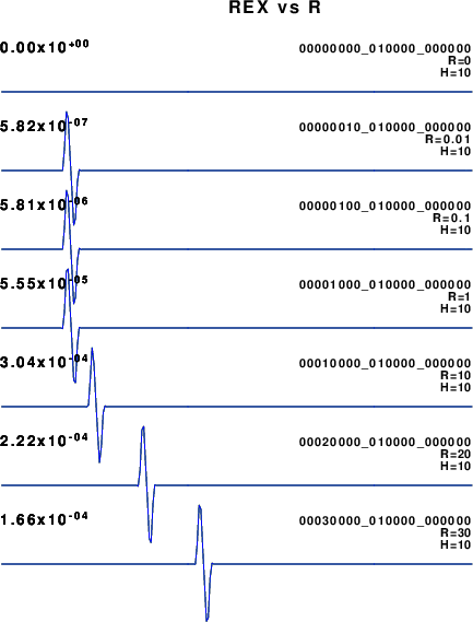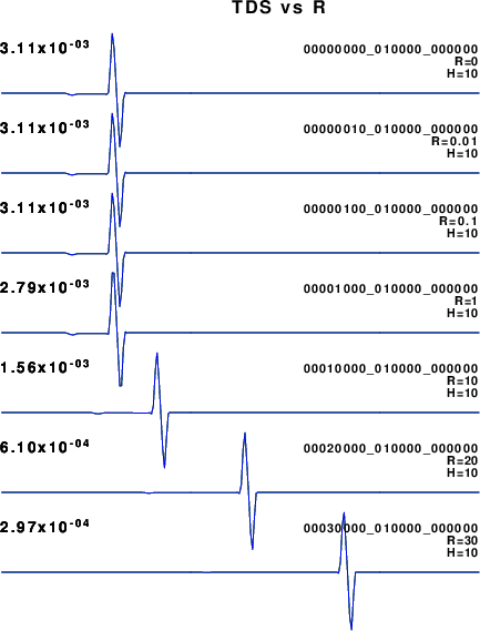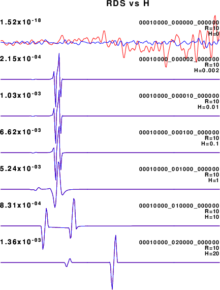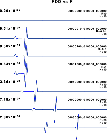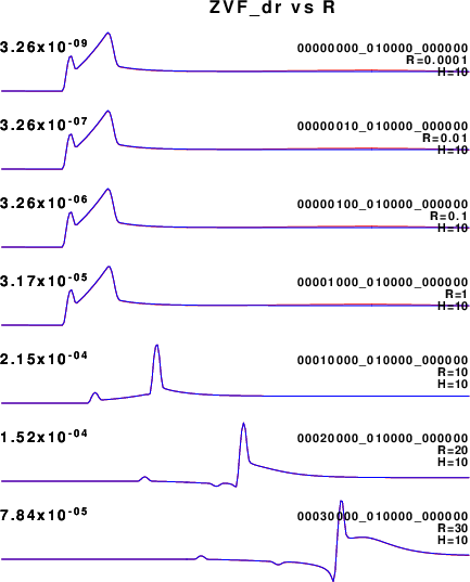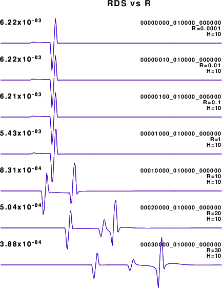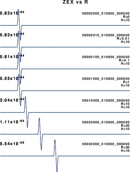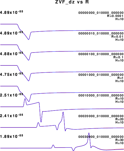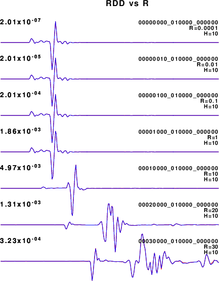 However larger differences are seen for fixed R=10 km as the source depth approaches the receiver depth. The hspec96strain (red curves) is supposed to be zero at H=0 for RDS, TDS, RVF, ZDD, ZEX, ZHF and REX. In most cases the true amplitude may be zero, and the difference reflects numerical error. There are bigger differences in the d/dz of RDD, REX, RHF, RSS, THF, TSS, ZDS. The d/dr of RDS and ZEX show differences.