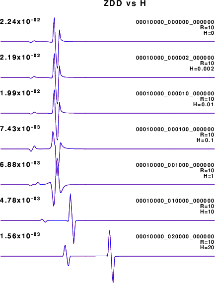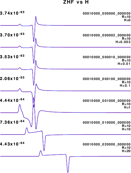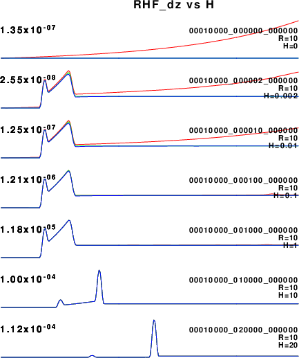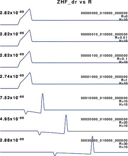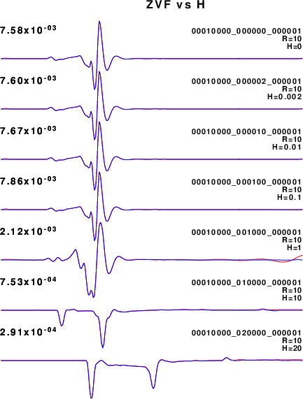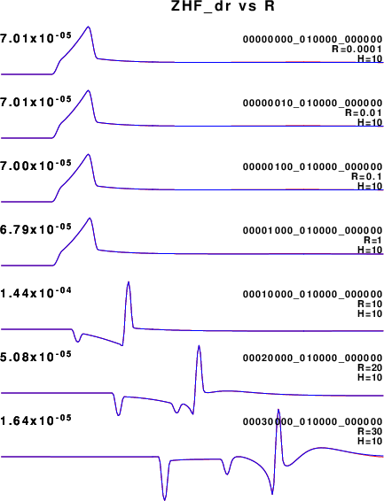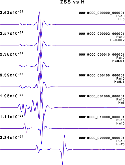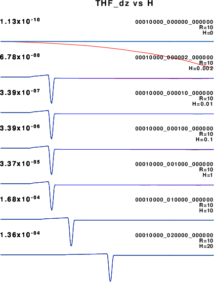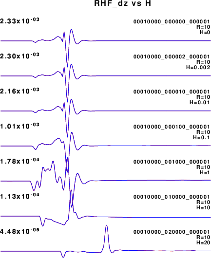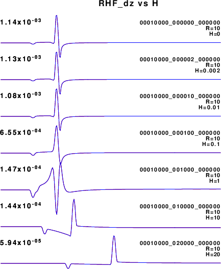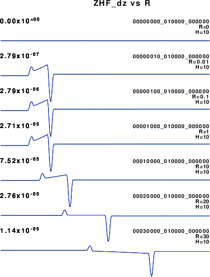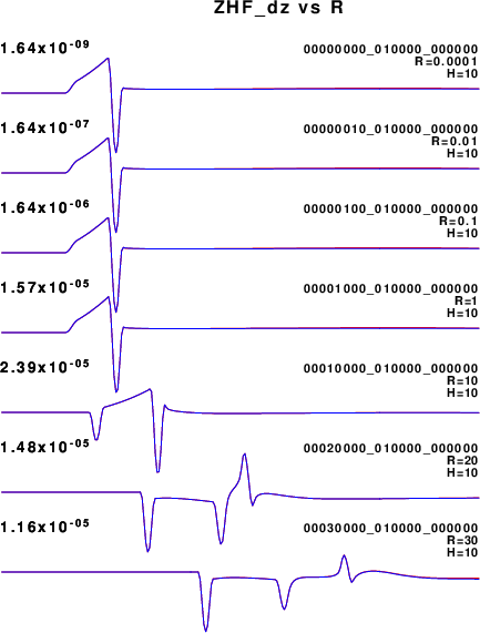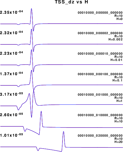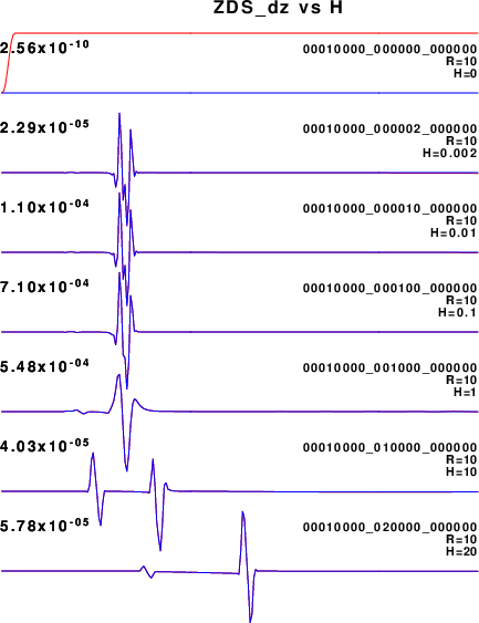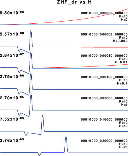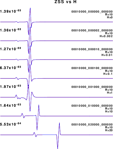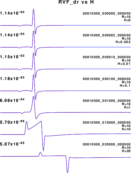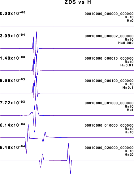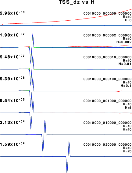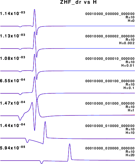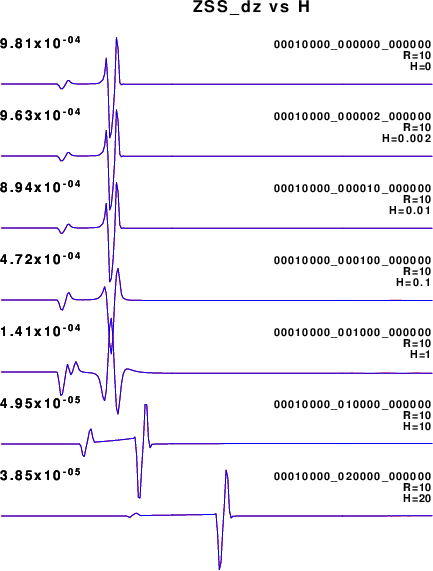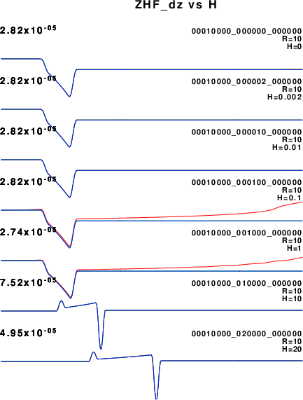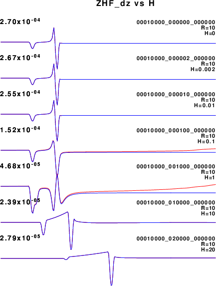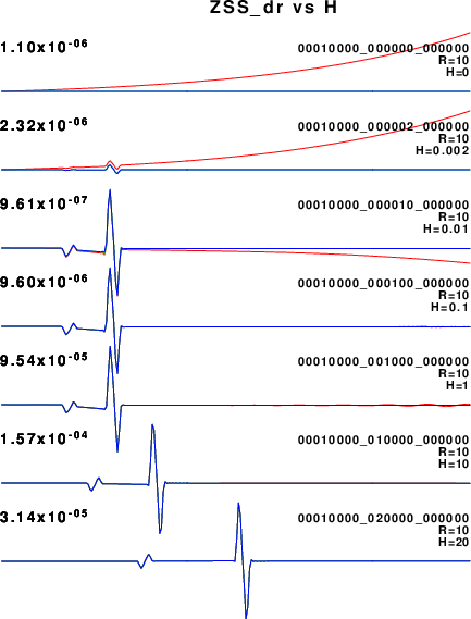 For fixed R, sshspec96strain is much better than hspec96strain as H → 0. The RDS and TDS at H=0 look noisy, but note that the4 amplitudes are very small. The d/dz of ZHF has some noise at about H=1 and the ZDS at H=0 (but is small). Both codes do well for the d/dr.