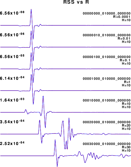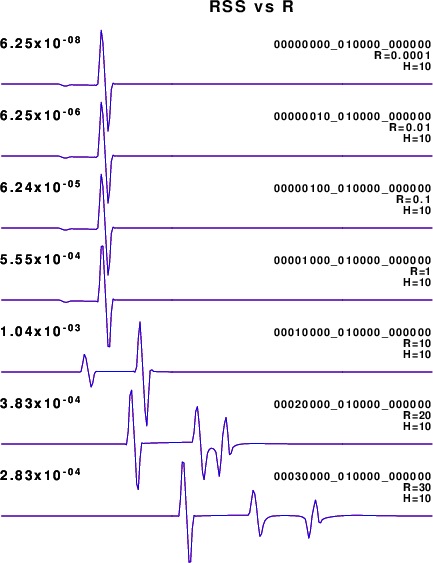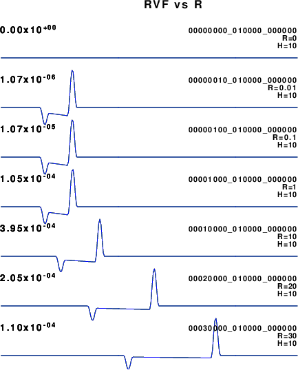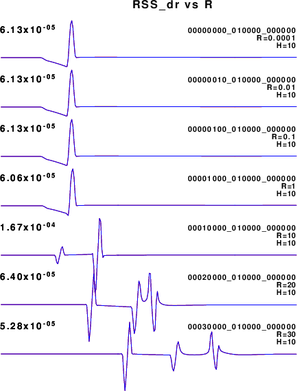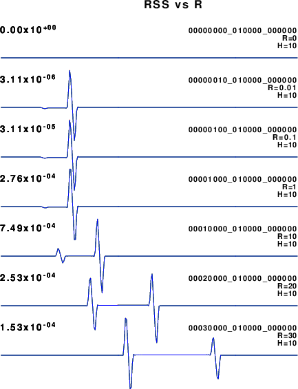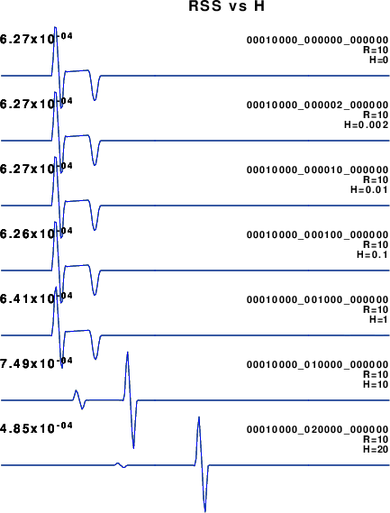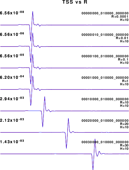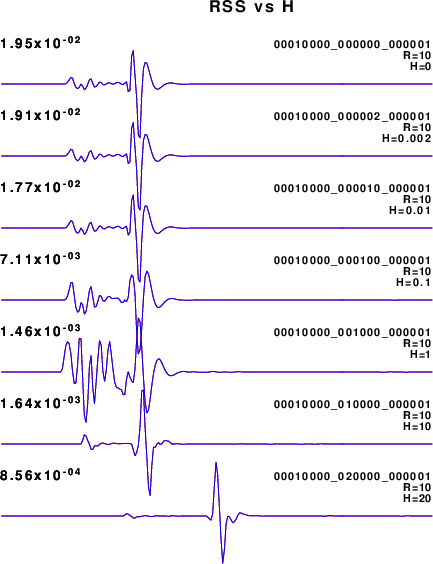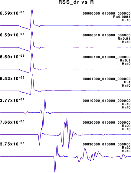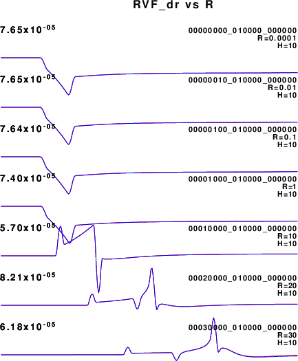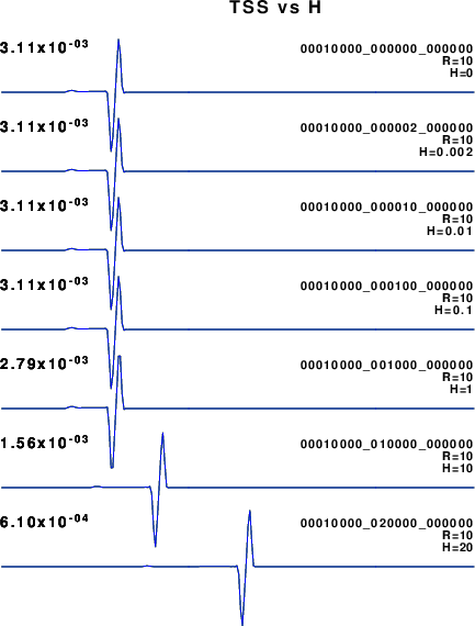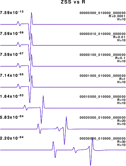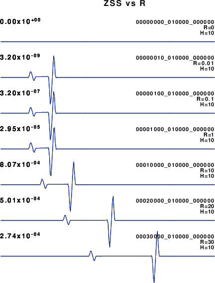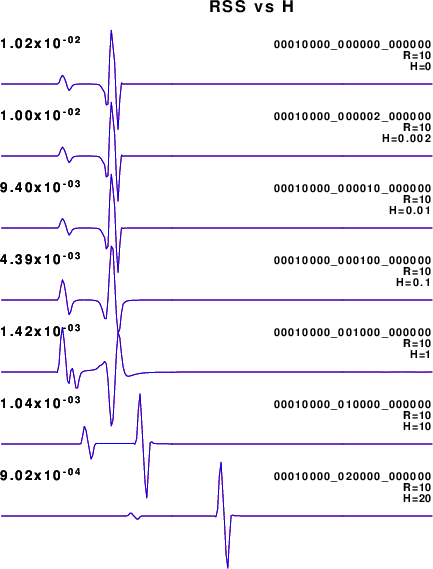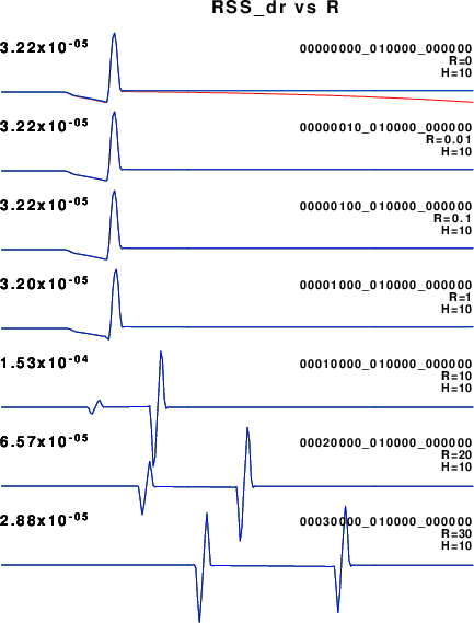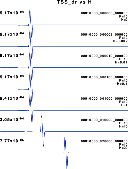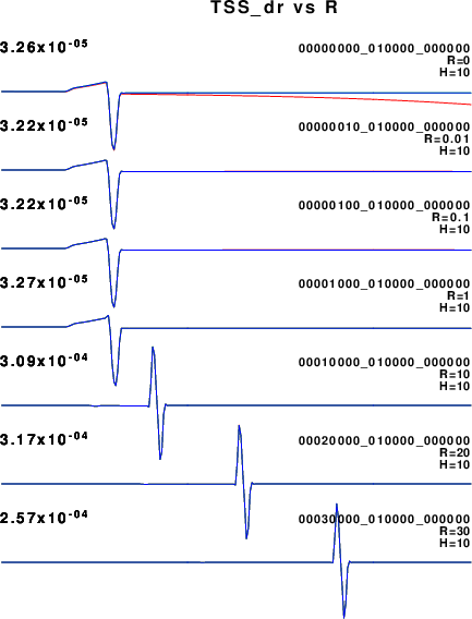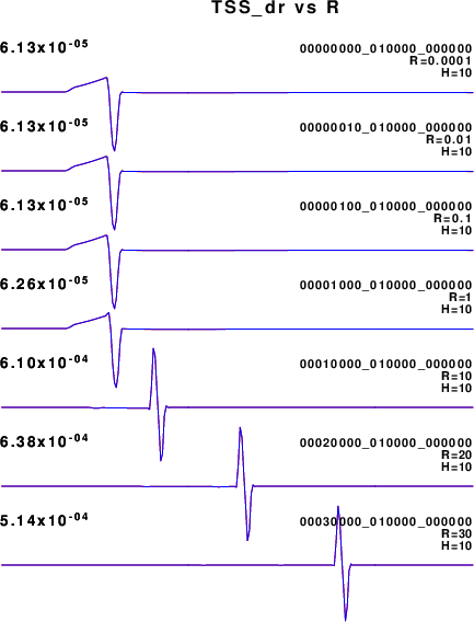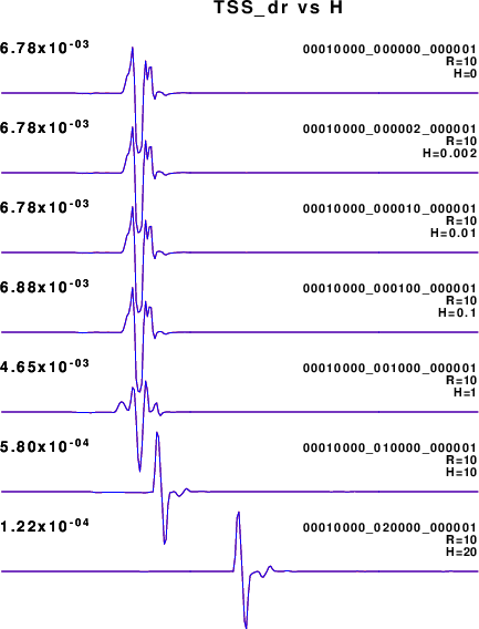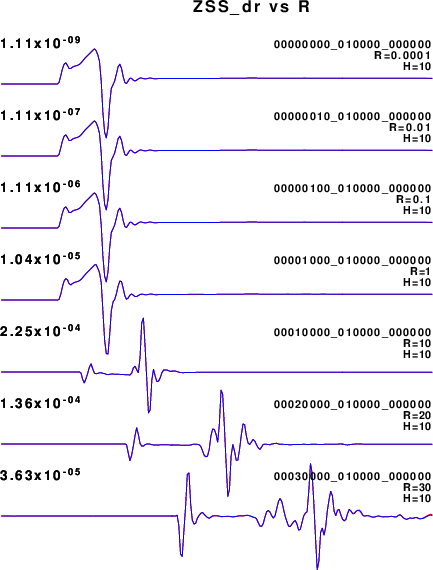 For the fixed source depth of H=10, the problems of hspec96strain at R=0 are seen in the d RVF/dr and d TSS/dr.