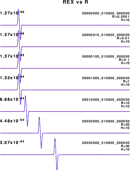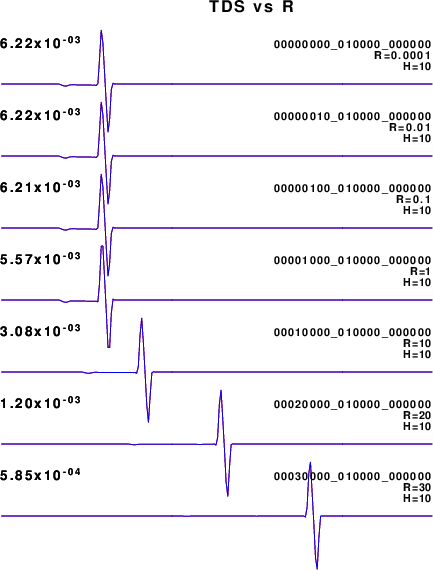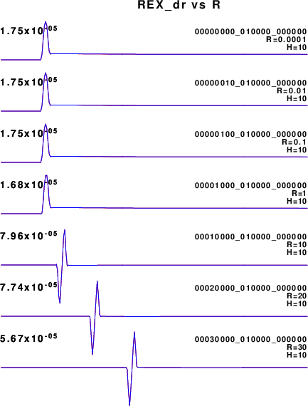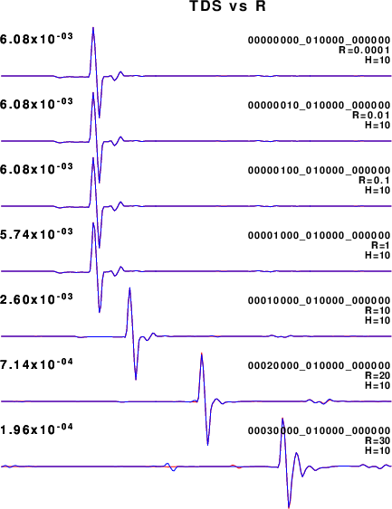 The resulting time series consist of 256 points. The comparison are displayed in figures seen by clicking on the links of the next table. In these figures, the red curve is the true solution from hspec96strain and the blue curve is from sshspec96strain and the traces are overlain. For this wholespace test, the green traces are obtained from hwhole96strain which only requires an inverse Fourier transform and thus does not involve the wavenumber integration. Each comparison is annotated with the peak amplitude, the leading part of the file name which indicates distance, source and receiver depths, the radial distance, as R=0.0001km, and the source depth, as H=10. The receiver depth is 0.0.