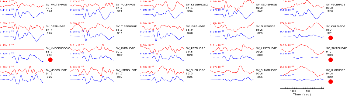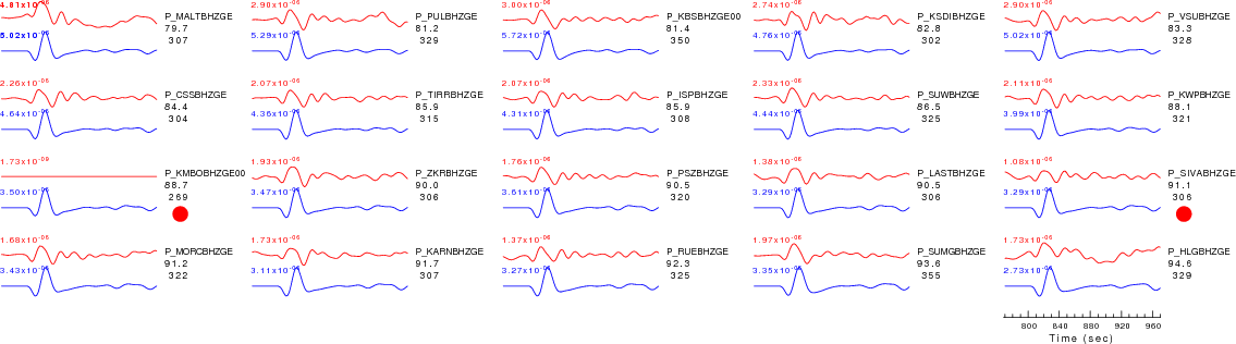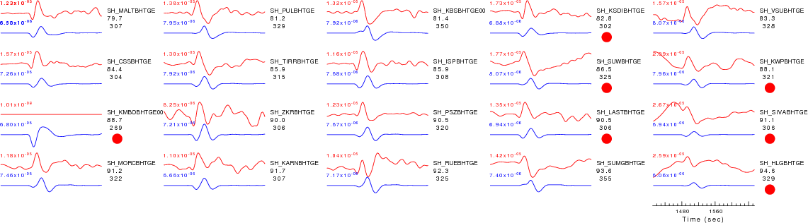 | Observed (red) and predicted seismograms (blue) ordered by increasing epicentral distance. Each pair of traces is annotated with the wave type and a station identifier (station, network, and channel id's), epicentral distance in degrees, source-to-station azimuth in degrees. Each seismogram pair is plotted with the same scale and the peak amplitudes in meters are shown above to the left of each trace. The optimal time shift between the observed first arrival and the predicted first arrival (in seconds) is shown above the prediction on the right. Red circles flag seismograms with amplitude misfits of a factor of 2 or more. |