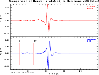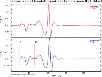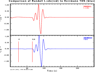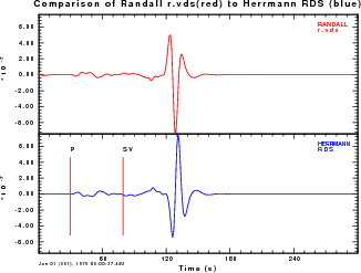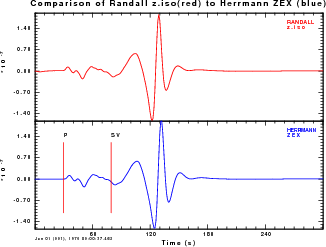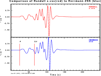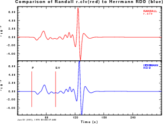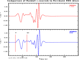 The focus of the comparison is on long periods, for which the slight difference in Q models will not be significant. However there will be slight timing differences since Randall's code uses acausal Q for reasons of speed, which the Herrmann code uses causal Q.