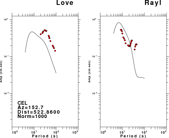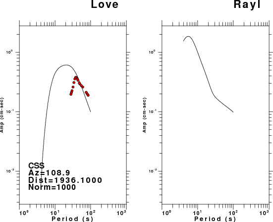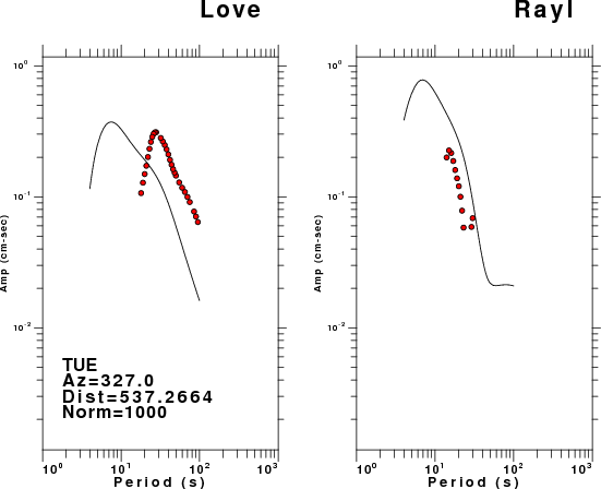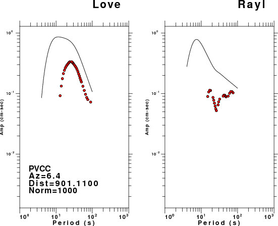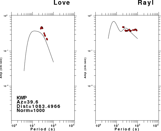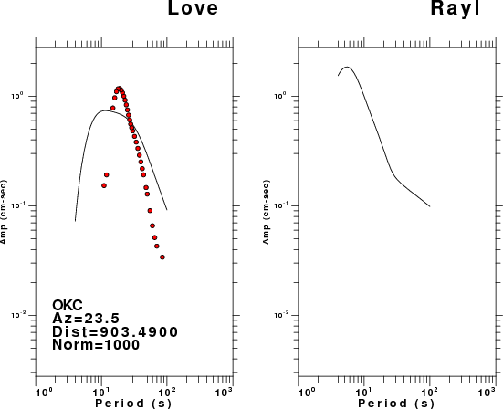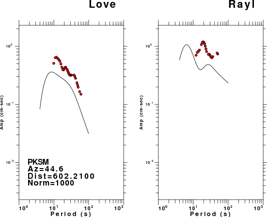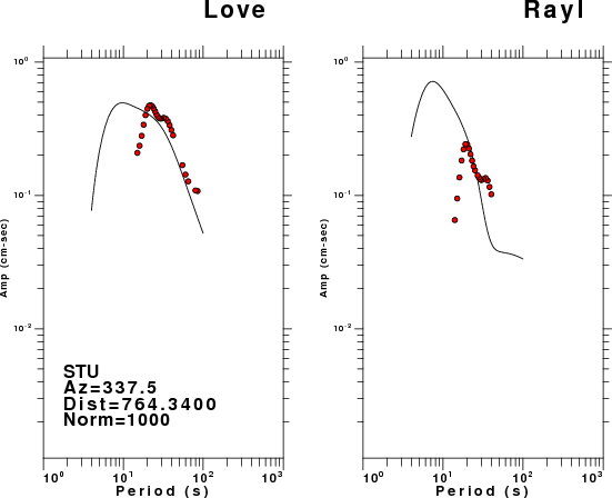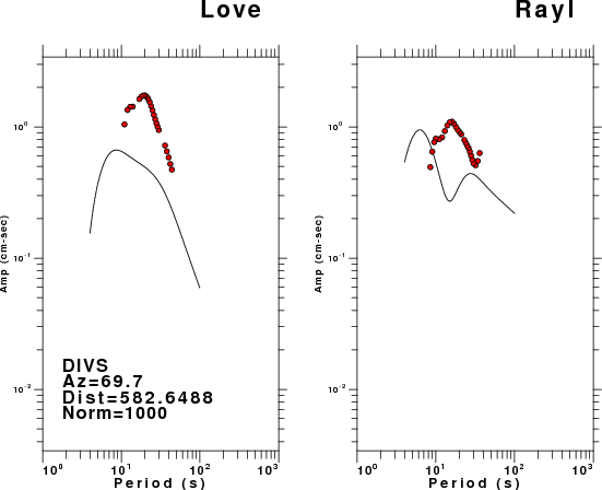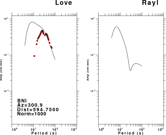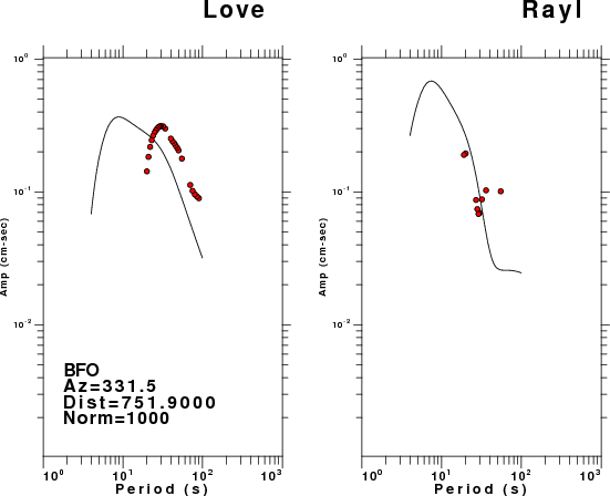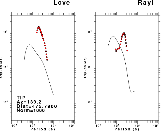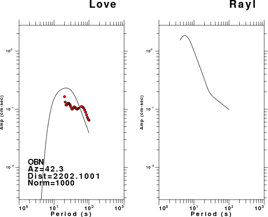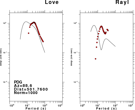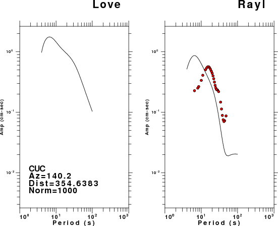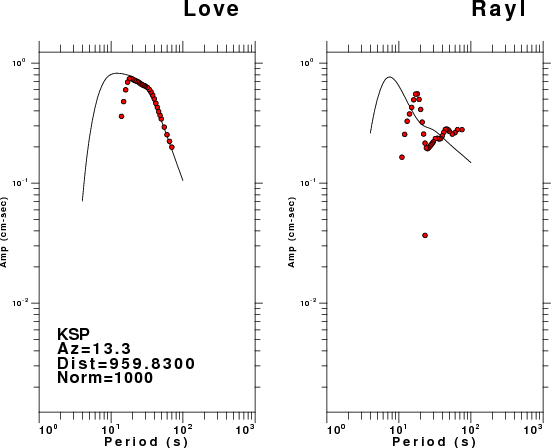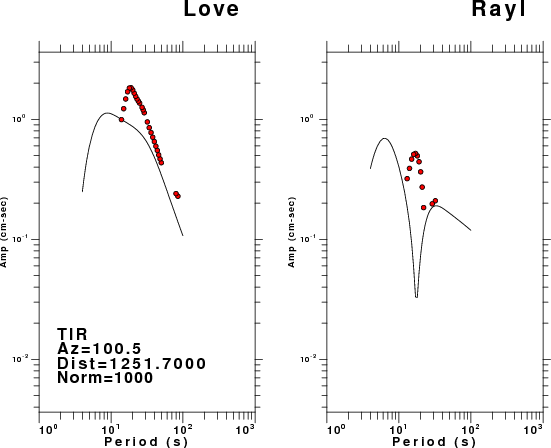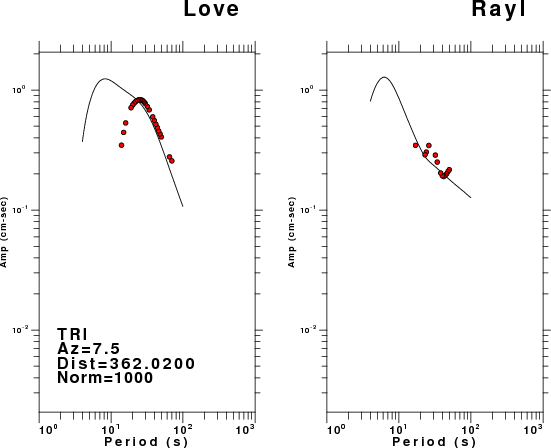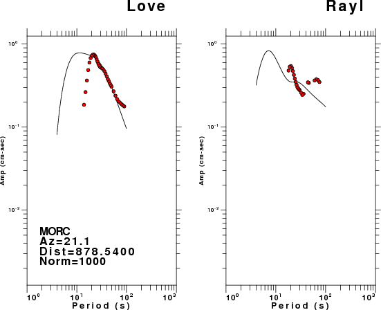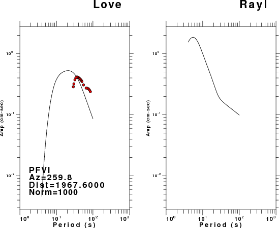 The figures below show the observed spectral amplitudes (units of cm-sec) at each station and the theoretical predictions as a function of period for the mechanism given above. The earth model listed below was used to define the Green's functions. For each station, the Love and Rayleigh wave spectral amplitudes are plotted with the same scaling so that one can get a sense fo the effects of the effects of the focal mechanism and depth on the excitation of each.