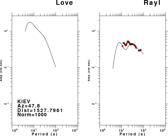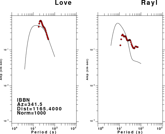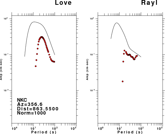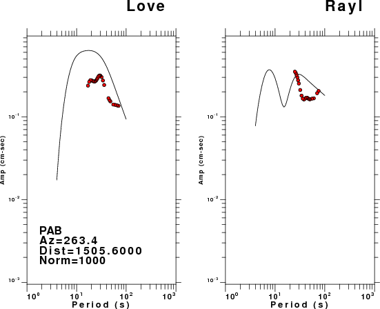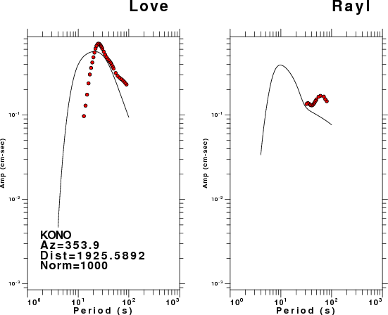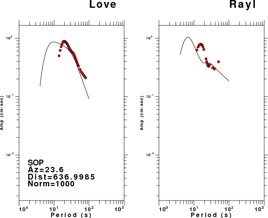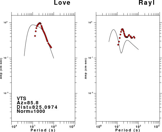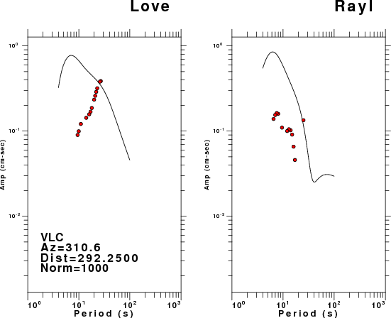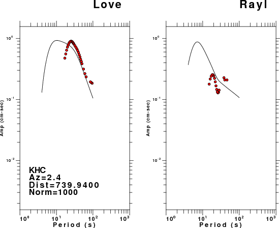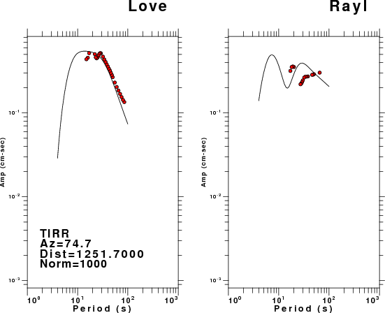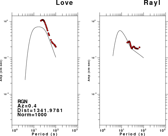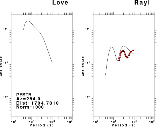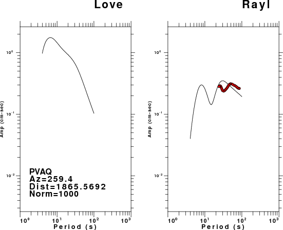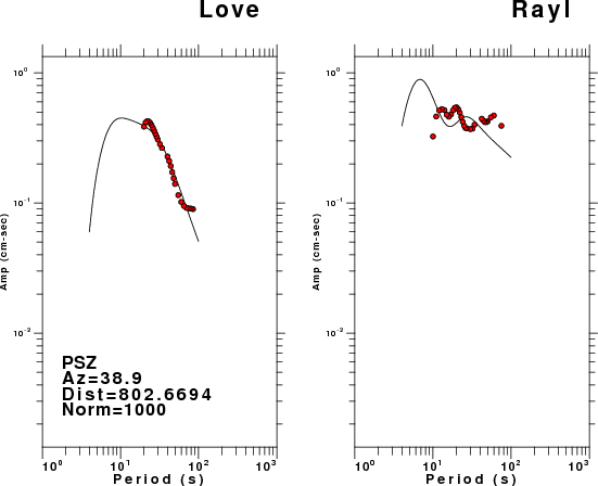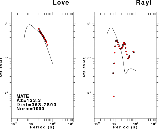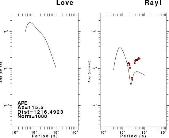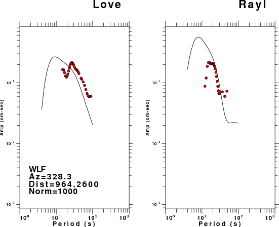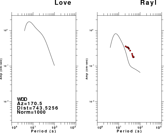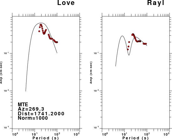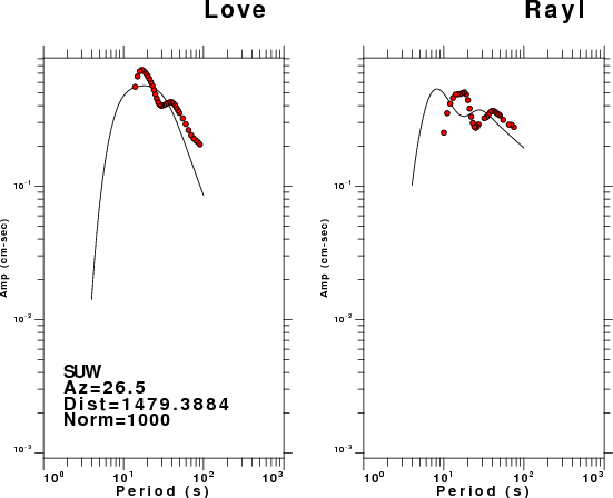 The figures below show the observed spectral amplitudes (units of cm-sec) at each station and the theoretical predictions as a function of period for the mechanism given above. The earth model listed below was used to define the Green's functions. For each station, the Love and Rayleigh wave spectral amplitudes are plotted with the same scaling so that one can get a sense fo the effects of the effects of the focal mechanism and depth on the excitation of each.