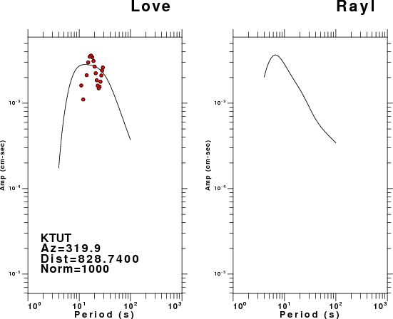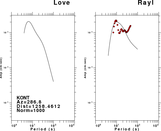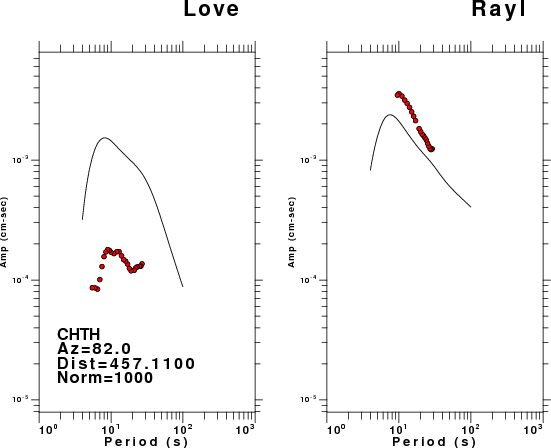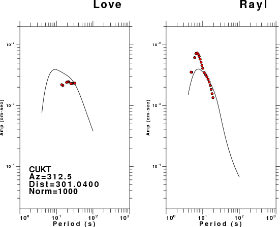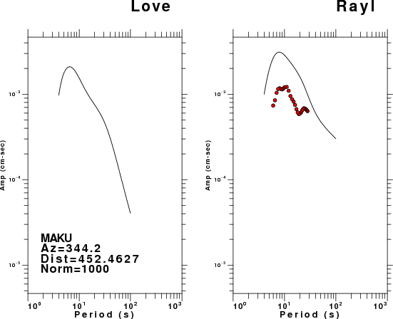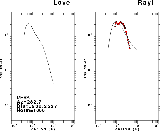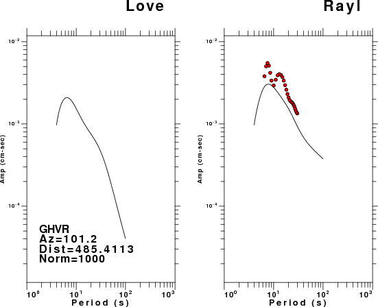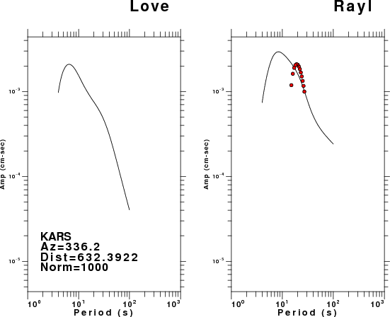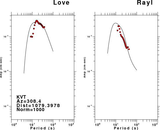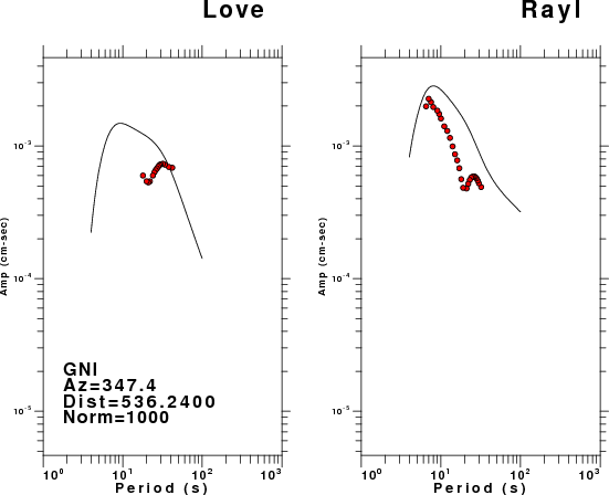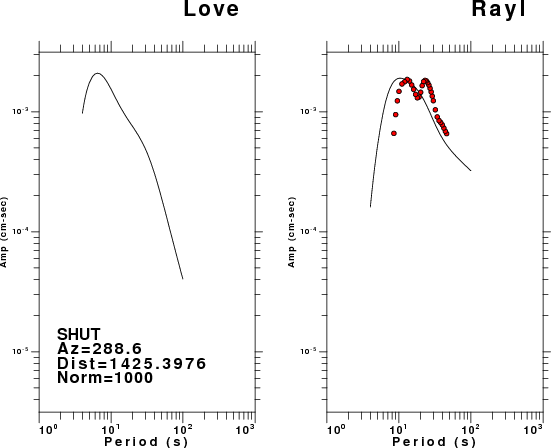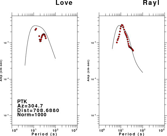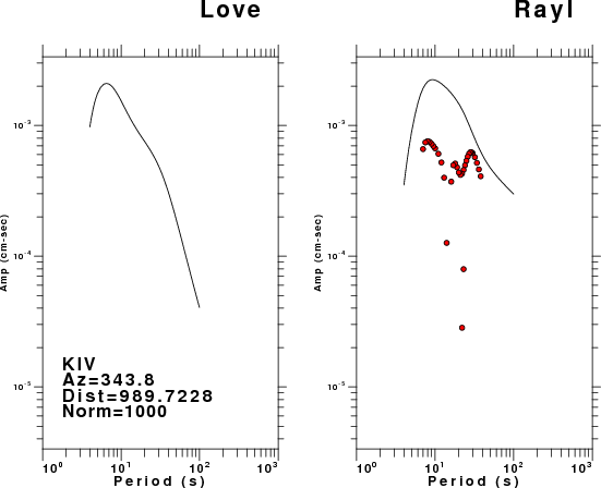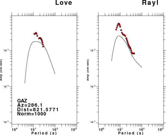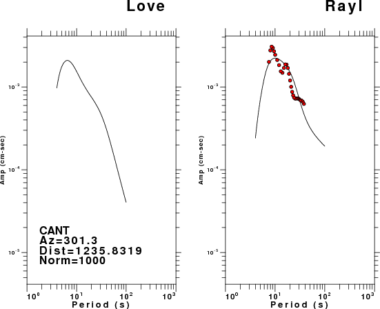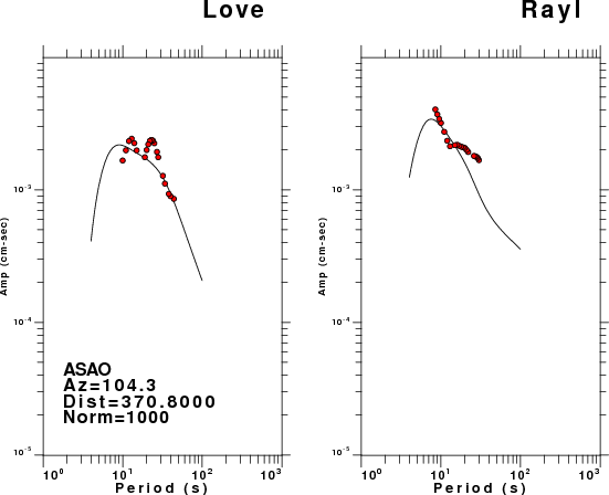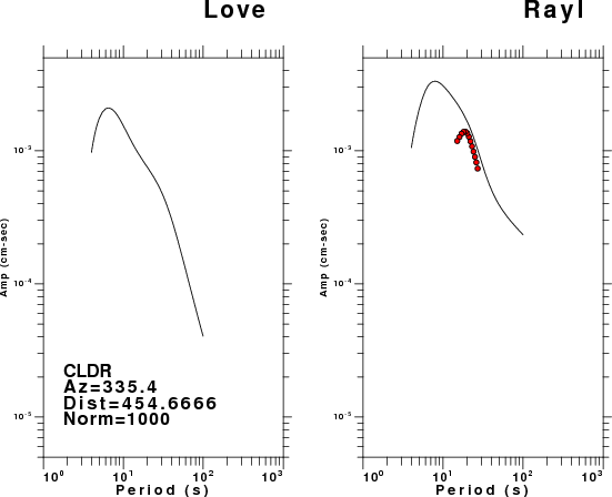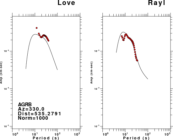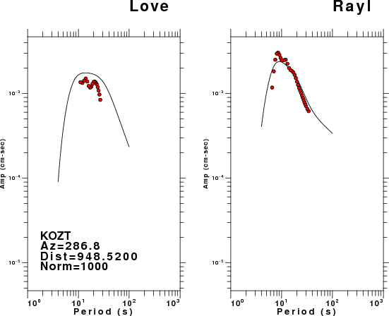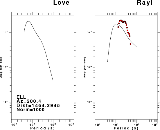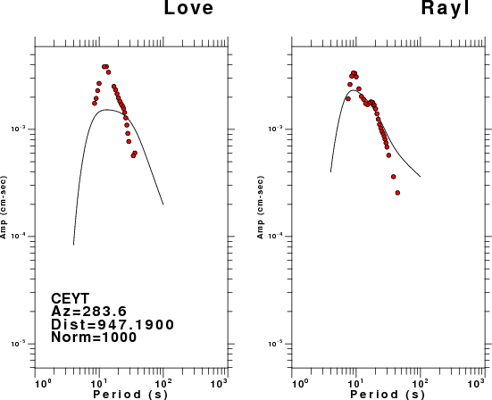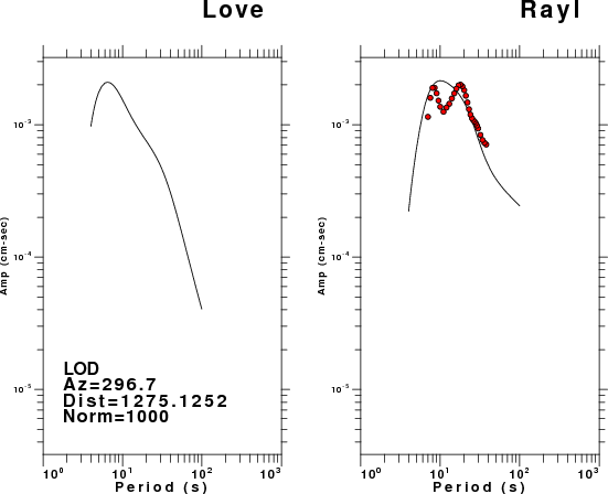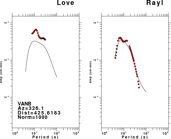 The figures below show the observed spectral amplitudes (units of cm-sec) at each station and the theoretical predictions as a function of period for the mechanism given above. The earth model listed below was used to define the Green's functions. For each station, the Love and Rayleigh wave spectral amplitudes are plotted with the same scaling so that one can get a sense fo the effects of the effects of the focal mechanism and depth on the excitation of each.