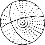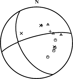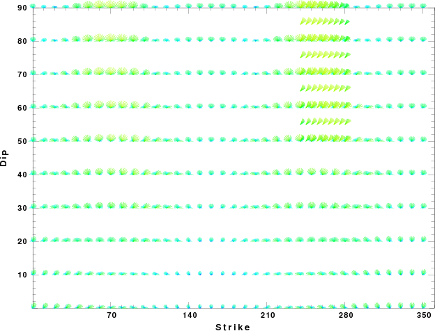 | Focal mechanism sensitivity at the preferred depth. The red color indicates a very good fit to thewavefroms. Each solution is plotted as a vector at a given value of strike and dip with the angle of the vector representing the rake angle, measured, with respect to the upward vertical (N) in the figure. |