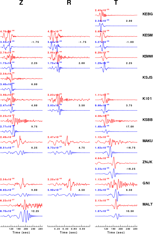 The comparison of the observed and predicted waveforms is given in the next figure. The red traces are the observed and the blue are the predicted. Each observed-predicted componnet is plotted to the same scale and peak amplitudes are indicated by the numbers to the left of each trace. The number in black at the rightr of each predicted traces it the time shift required for maximum correlation between the observed and predicted traces. This time shift is required because the synthetics are not computed at exactly the same distance as the observed and because the velocity model used in the predictions may not be perfect. A positive time shift indicates that the prediction is too fast and should be delayed to match the observed trace (shift to the right in this figure). A negative value indicates that the prediction is too slow. The bandpass filter used in the processing and for the display was