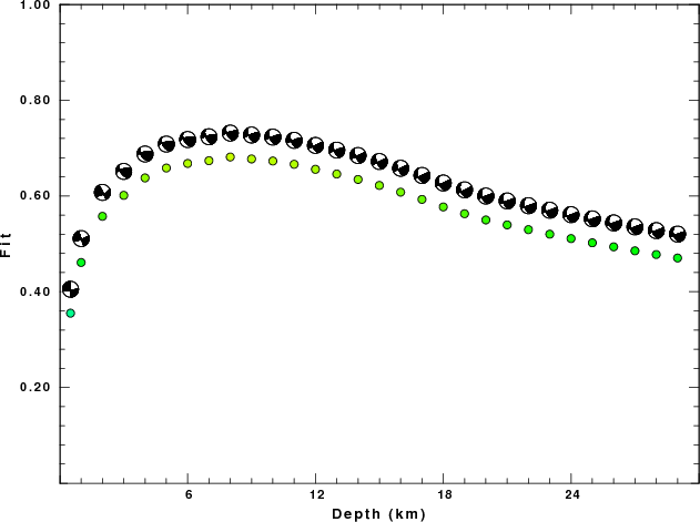 The program wvfgrd96 was used with good traces observed at short distance to determine the focal mechanism, depth and seismic moment. This technique requires a high quality signal and well determined velocity model for the Green functions. To the extent that these are the quality data, this type of mechanism should be preferred over the radiation pattern technique which requires the separate step of defining the pressure and tension quadrants and the correct strike.