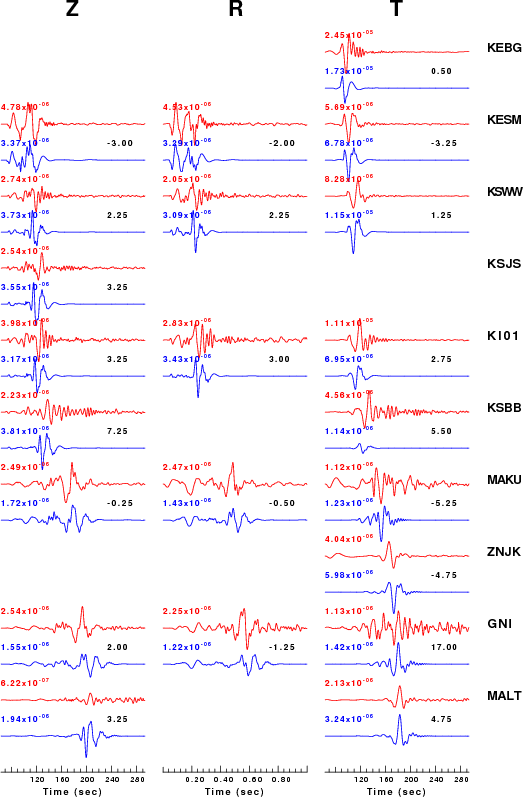 The comparison of the observed and predicted waveforms is given in the next figure. The red traces are the observed and the blue are the predicted. Each observed-predicted componnet is plotted to the same scale and peak amplitudes are indicated by the numbers to the left of each trace. The number in black at the rightr of each predicted traces it the time shift required for maximum correlation between the observed and predicted traces. This time shift is required because the synthetics are not computed at exactly the same distance as the observed and because the velocity model used in the predictions may not be perfect. A positive time shift indicates that the prediction is too fast and should be delayed to match the observed trace (shift to the right in this figure). A negative value indicates that the prediction is too slow. The bandpass filter used in the processing and for the display was