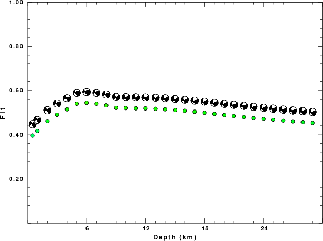 The program wvfgrd96 was used with good traces observed at short distance to determine the focal mechanism, depth and seismic moment. This technique requires a high quality signal and well determined velocity model for the Green functions. To the extent that these are the quality data, this type of mechanism should be preferred over the radiation pattern technique which requires the separate step of defining the pressure and tension quadrants and the correct strike.