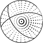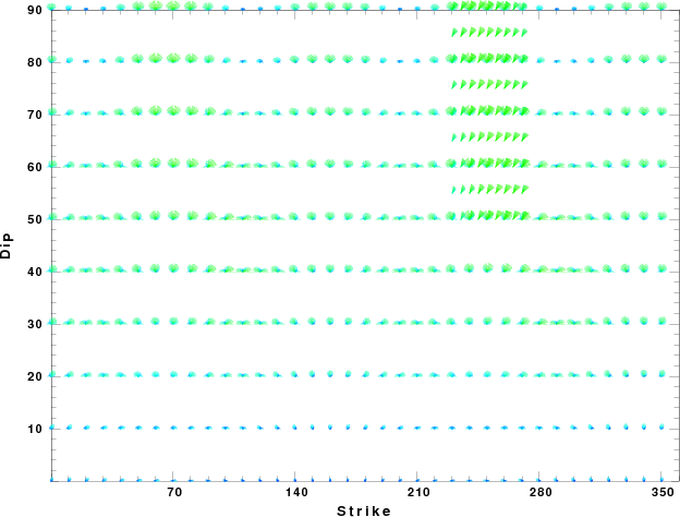 | Focal mechanism sensitivity at the preferred depth. The red color indicates a very good fit to thewavefroms. Each solution is plotted as a vector at a given value of strike and dip with the angle of the vector representing the rake angle, measured, with respect to the upward vertical (N) in the figure. |