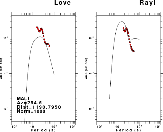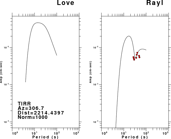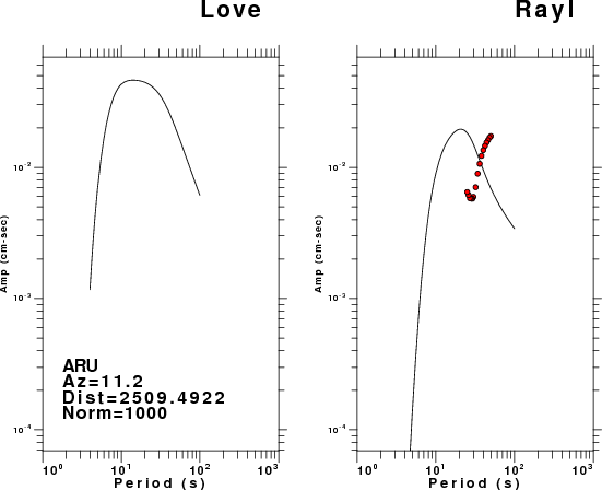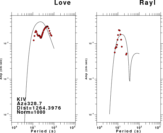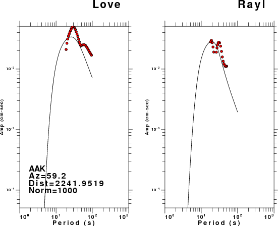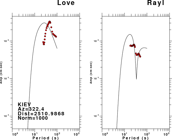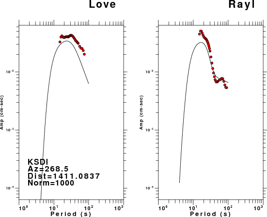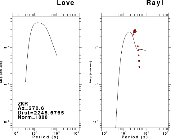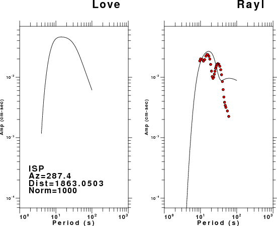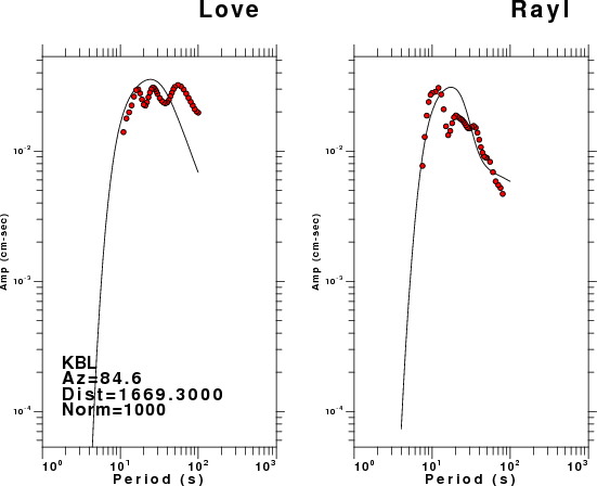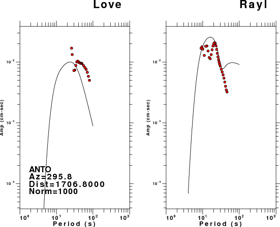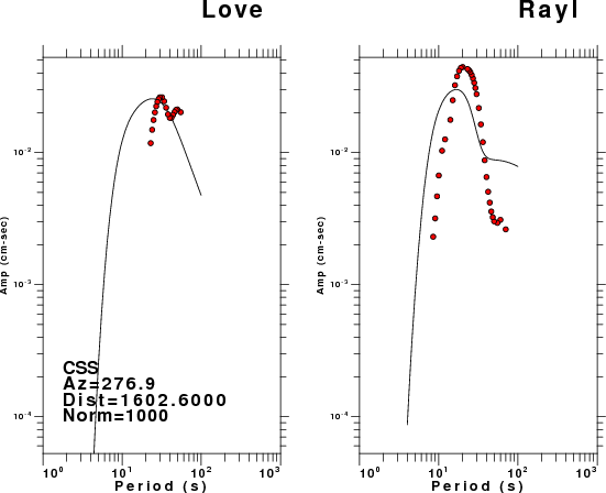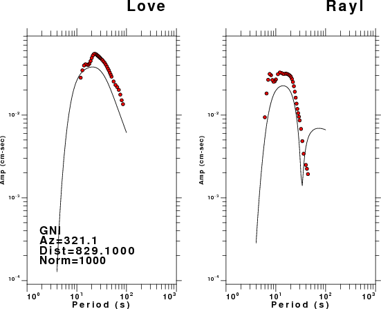The figures below show the observed spectral amplitudes (units of cm-sec) at each station and the theoretical predictions as a function of period for the mechanism given above. The earth model listed below was used to define the Green's functions. For each station, the Love and Rayleigh wave spectral amplitudes are plotted with the same scaling so that one can get a sense fo the effects of the effects of the focal mechanism and depth on the excitation of each.