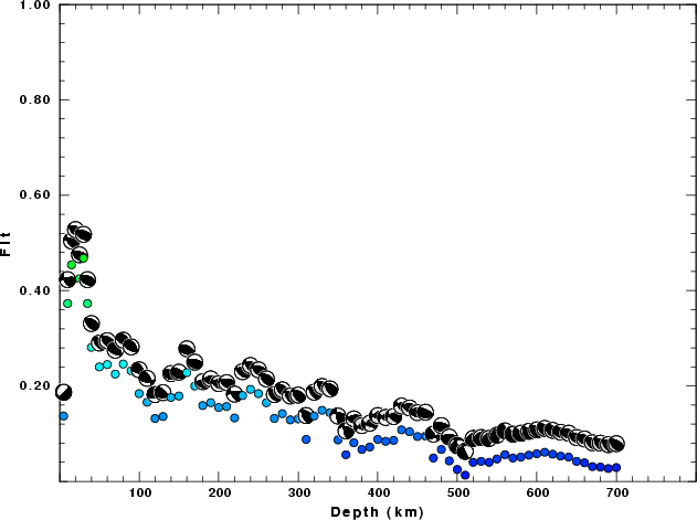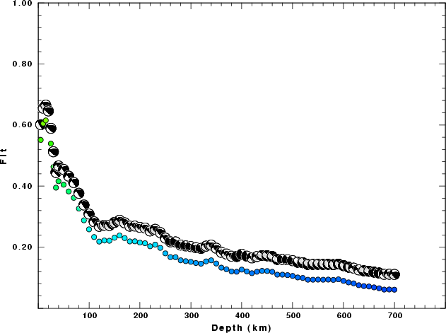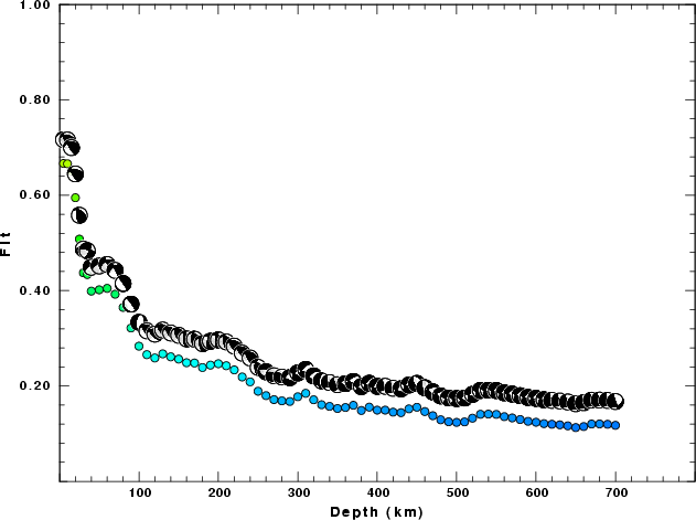 | Goodness of fit as a function of source depth. The measure is 1 - SUM (o -p)2 / SUM o2. A value of 1.0 is the best fit. The best double couple mechanism for the solution depth is plotted above goodness of fit value to indicate how the mefhanism may change with depth. |