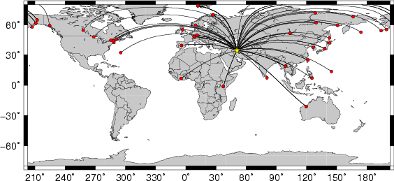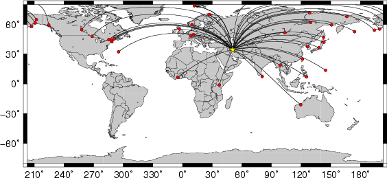 Location of the earthquake (yellow star) and great circle path from the epicenter to each station (red) [created using GMT (Wessel, P., and W. H. F. Smith, New version of Generic Mapping Tools released, EOS Trans. AGU, 76 329, 1995.)] |