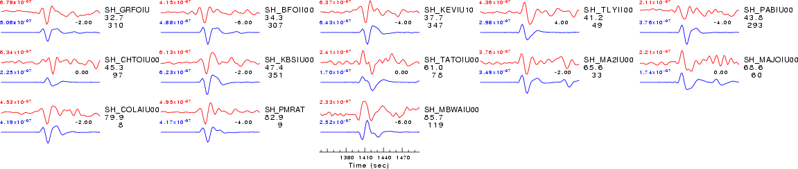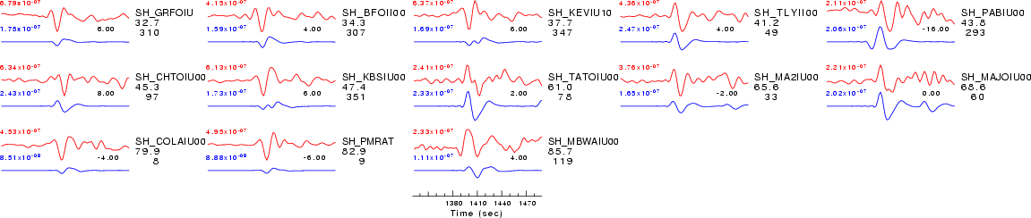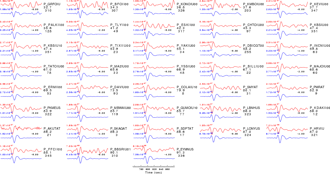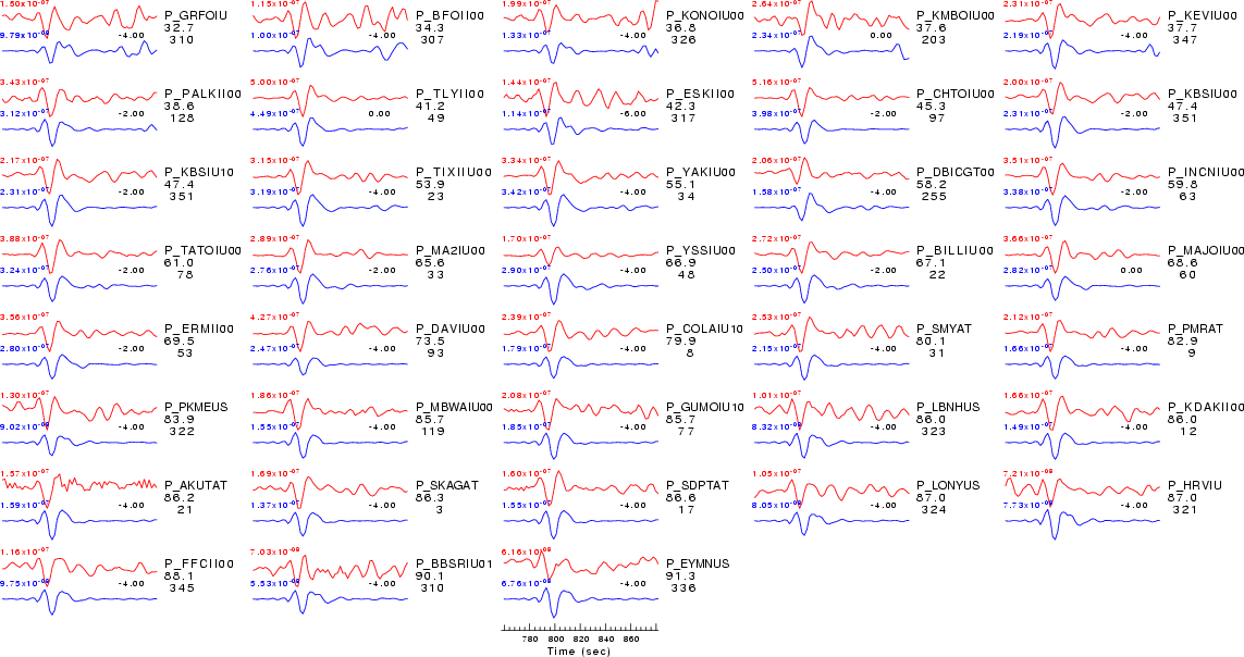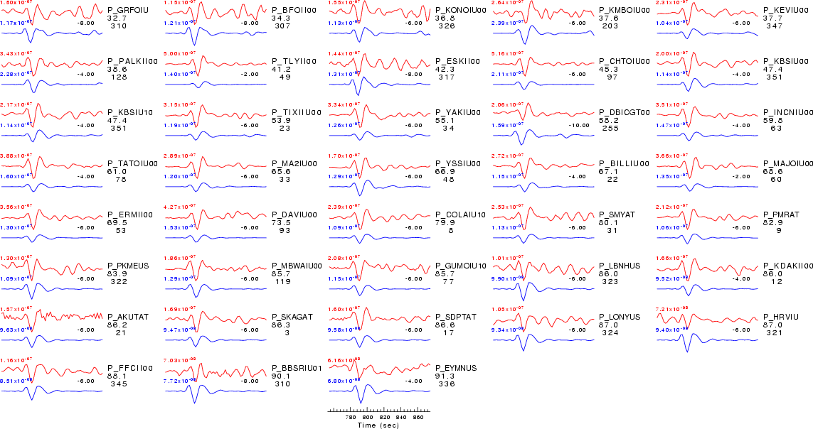 | Comparison of the observed traces (red) and solution predicted traces (blue) ordered in terms of increasing epicentral distance. Each pair of traces is annotated with the station name, epicentral distance in degrees, source to station azimuth in degrees. Each pair of traces is plotted with the same scale and the peak amplitudes are indicated at the lect of each trace. Finally the time shift between the P-wave first arrival picked and the the theoretical P-wave first arrival in the predicted trace is indicated, with a positive sign indicating that the predicted trace has been shifted to the right by the given number of seconds. as a function of source to station azimuth in degrees (D). The purpose of this display is to highlight the azimuthal dependence on the first motion. The traces are annotated with the station name at the top. |