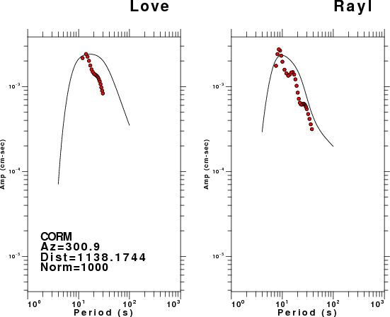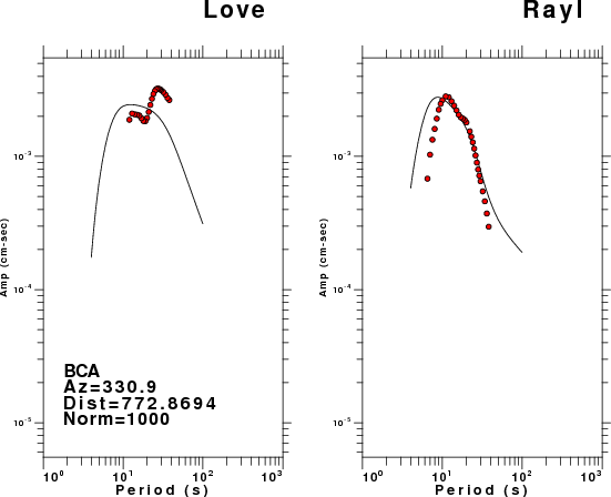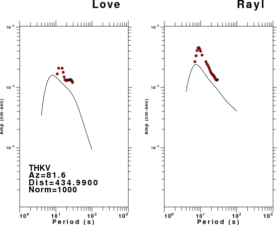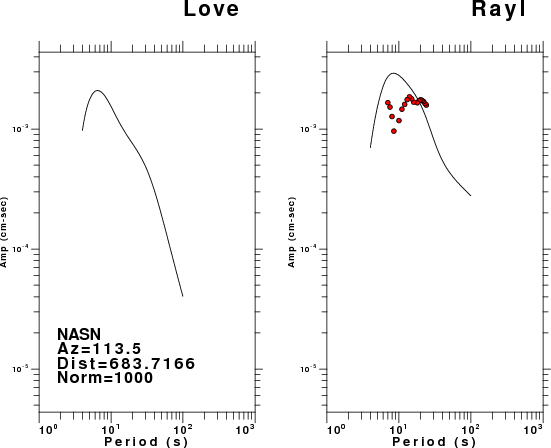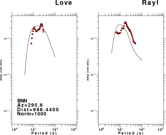 The figures below show the observed spectral amplitudes (units of cm-sec) at each station and the theoretical predictions as a function of period for the mechanism given above. The earth model listed below was used to define the Green's functions. For each station, the Love and Rayleigh wave spectral amplitudes are plotted with the same scaling so that one can get a sense fo the effects of the effects of the focal mechanism and depth on the excitation of each.
