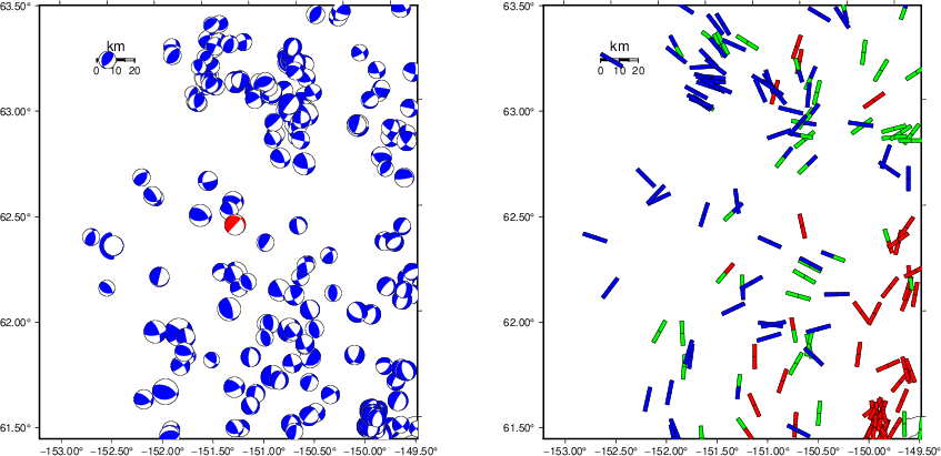 Focal mechanism sensitivity at the preferred depth. The red color indicates a very good fit to the waveforms. Each solution is plotted as a vector at a given value of strike and dip with the angle of the vector representing the rake angle, measured, with respect to the upward vertical (N) in the figure. |