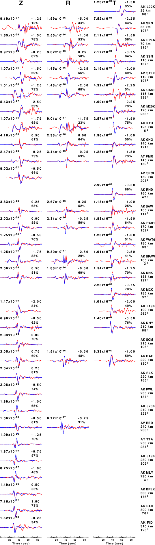 The comparison of the observed and predicted waveforms is given in the next figure. The red traces are the observed and the blue are the predicted. Each observed-predicted component is plotted to the same scale and peak amplitudes are indicated by the numbers to the left of each trace. A pair of numbers is given in black at the right of each predicted traces. The upper number it the time shift required for maximum correlation between the observed and predicted traces. This time shift is required because the synthetics are not computed at exactly the same distance as the observed, the velocity model used in the predictions may not be perfect and the epicentral parameters may be be off. A positive time shift indicates that the prediction is too fast and should be delayed to match the observed trace (shift to the right in this figure). A negative value indicates that the prediction is too slow. The lower number gives the percentage of variance reduction to characterize the individual goodness of fit (100% indicates a perfect fit).