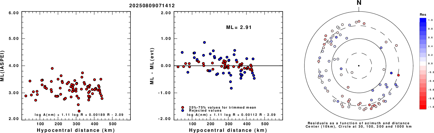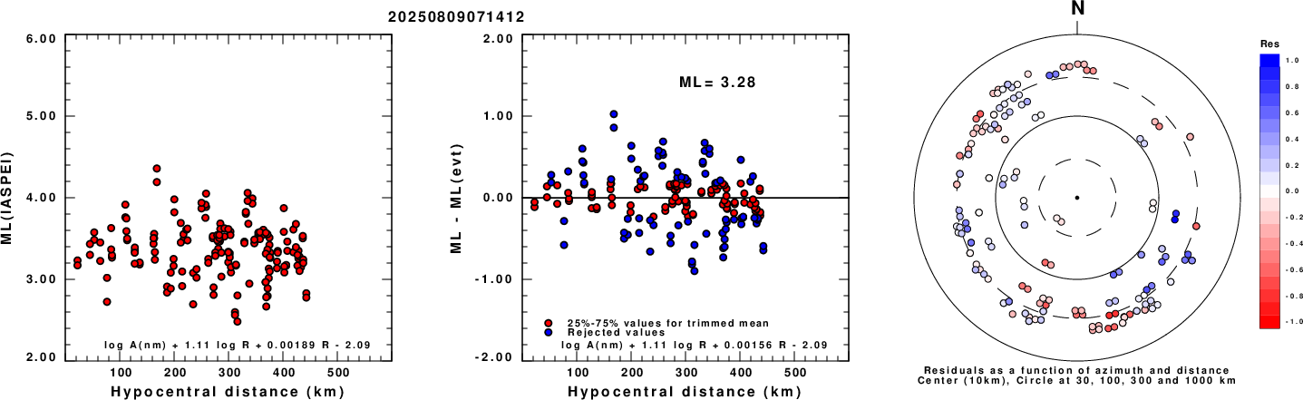 Left: ML computed using the IASPEI formula for Vertical components (research). Center: ML residuals computed using a modified IASPEI formula that accounts for path specific attenuation; the values used for the trimmed mean are indicated. The ML relation used for each figure is given at the bottom of each plot.