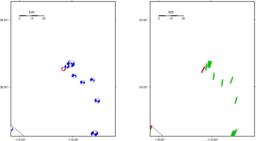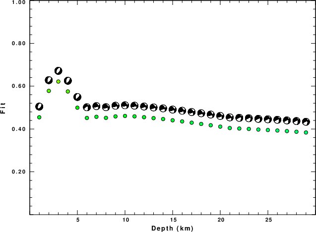 The program wvfgrd96 was used with good traces observed at short distance to determine the focal mechanism, depth and seismic moment. This technique requires a high quality signal and well determined velocity model for the Green's functions. To the extent that these are the quality data, this type of mechanism should be preferred over the radiation pattern technique which requires the separate step of defining the pressure and tension quadrants and the correct strike.