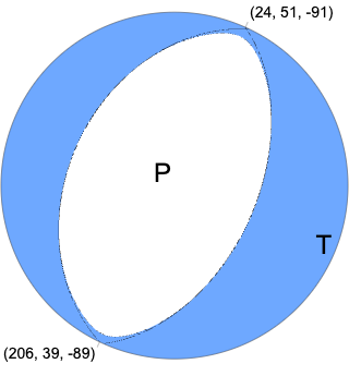 Moment Tensor Moment 2.153e+14 N-m Magnitude 3.49 Depth 7.0 km Percent DC 98% Half Duration - Catalog NN Data Source NN Contributor NN Nodal Planes Plane Strike Dip Rake NP1 206 39 -89 NP2 24 51 -91 Principal Axes Axis Value Plunge Azimuth T 2.141e+14 6 115 N 0.024e+14 1 25 P -2.166e+14 84 288 |