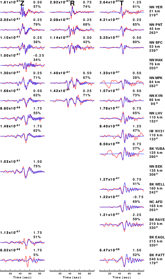 The comparison of the observed and predicted waveforms is given in the next figure. The red traces are the observed and the blue are the predicted. Each observed-predicted component is plotted to the same scale and peak amplitudes are indicated by the numbers to the left of each trace. A pair of numbers is given in black at the right of each predicted traces. The upper number it the time shift required for maximum correlation between the observed and predicted traces. This time shift is required because the synthetics are not computed at exactly the same distance as the observed, the velocity model used in the predictions may not be perfect and the epicentral parameters may be be off. A positive time shift indicates that the prediction is too fast and should be delayed to match the observed trace (shift to the right in this figure). A negative value indicates that the prediction is too slow. The lower number gives the percentage of variance reduction to characterize the individual goodness of fit (100% indicates a perfect fit).