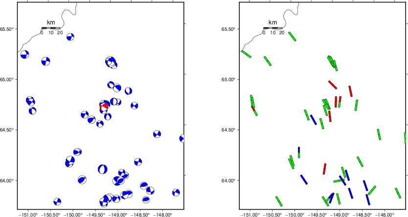 The focal mechanism was determined using broadband seismic waveforms. The location of the event (star) and the stations used for (red) the waveform inversion are shown in the next figure.