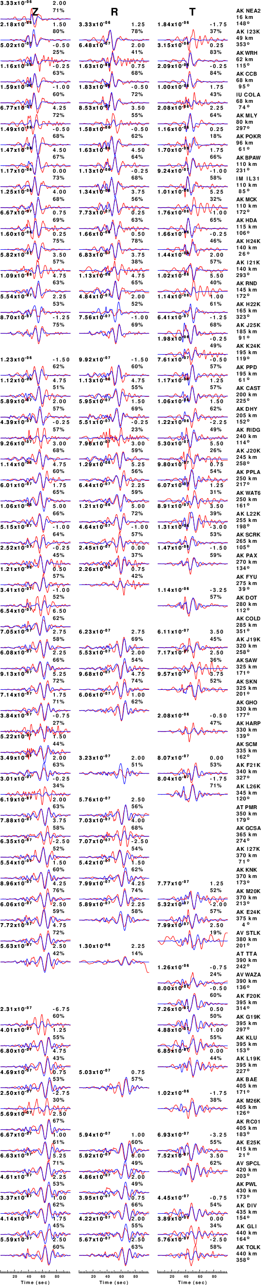 The comparison of the observed and predicted waveforms is given in the next figure. The red traces are the observed and the blue are the predicted. Each observed-predicted component is plotted to the same scale and peak amplitudes are indicated by the numbers to the left of each trace. A pair of numbers is given in black at the right of each predicted traces. The upper number it the time shift required for maximum correlation between the observed and predicted traces. This time shift is required because the synthetics are not computed at exactly the same distance as the observed, the velocity model used in the predictions may not be perfect and the epicentral parameters may be be off. A positive time shift indicates that the prediction is too fast and should be delayed to match the observed trace (shift to the right in this figure). A negative value indicates that the prediction is too slow. The lower number gives the percentage of variance reduction to characterize the individual goodness of fit (100% indicates a perfect fit).