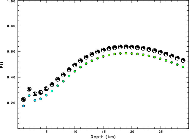 The program wvfgrd96 was used with good traces observed at short distance to determine the focal mechanism, depth and seismic moment. This technique requires a high quality signal and well determined velocity model for the Green's functions. To the extent that these are the quality data, this type of mechanism should be preferred over the radiation pattern technique which requires the separate step of defining the pressure and tension quadrants and the correct strike.