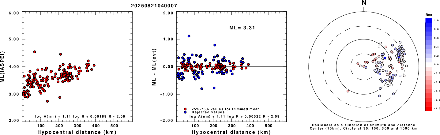 Left: ML computed using the IASPEI formula for Vertical components (research). Center: ML residuals computed using a modified IASPEI formula that accounts for path specific attenuation; the values used for the trimmed mean are indicated. The ML relation used for each figure is given at the bottom of each plot.