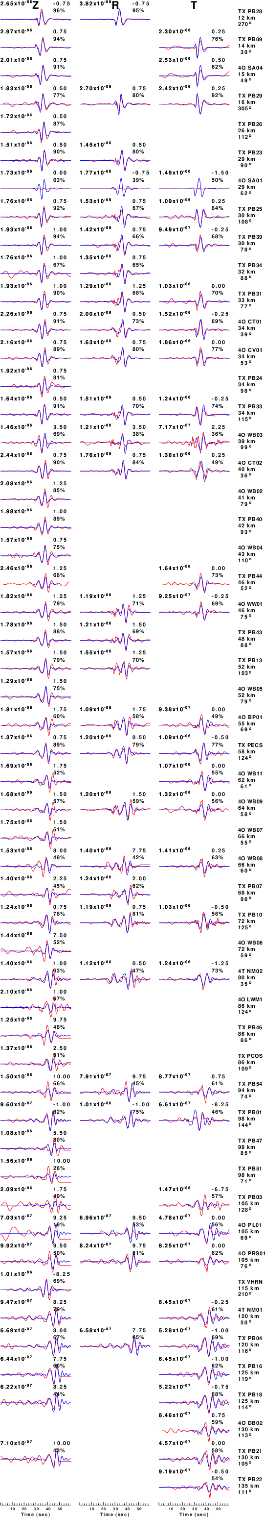 The comparison of the observed and predicted waveforms is given in the next figure. The red traces are the observed and the blue are the predicted. Each observed-predicted component is plotted to the same scale and peak amplitudes are indicated by the numbers to the left of each trace. A pair of numbers is given in black at the right of each predicted traces. The upper number it the time shift required for maximum correlation between the observed and predicted traces. This time shift is required because the synthetics are not computed at exactly the same distance as the observed, the velocity model used in the predictions may not be perfect and the epicentral parameters may be be off. A positive time shift indicates that the prediction is too fast and should be delayed to match the observed trace (shift to the right in this figure). A negative value indicates that the prediction is too slow. The lower number gives the percentage of variance reduction to characterize the individual goodness of fit (100% indicates a perfect fit).