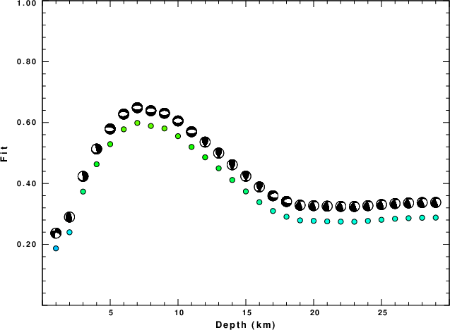 The program wvfgrd96 was used with good traces observed at short distance to determine the focal mechanism, depth and seismic moment. This technique requires a high quality signal and well determined velocity model for the Green's functions. To the extent that these are the quality data, this type of mechanism should be preferred over the radiation pattern technique which requires the separate step of defining the pressure and tension quadrants and the correct strike.