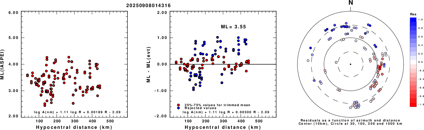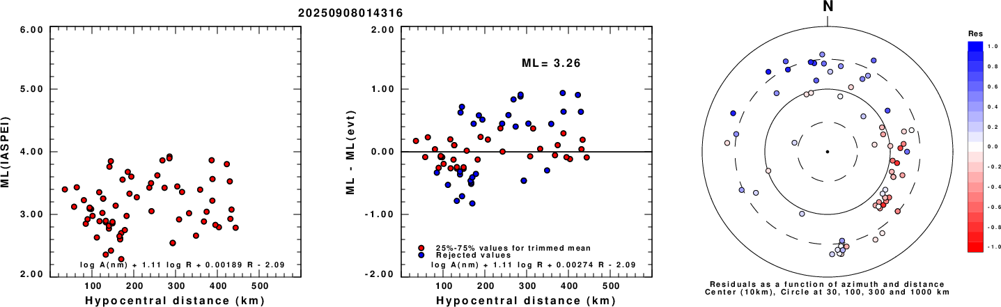 Left: ML computed using the IASPEI formula for Vertical components (research). Center: ML residuals computed using a modified IASPEI formula that accounts for path specific attenuation; the values used for the trimmed mean are indicated. The ML relation used for each figure is given at the bottom of each plot.