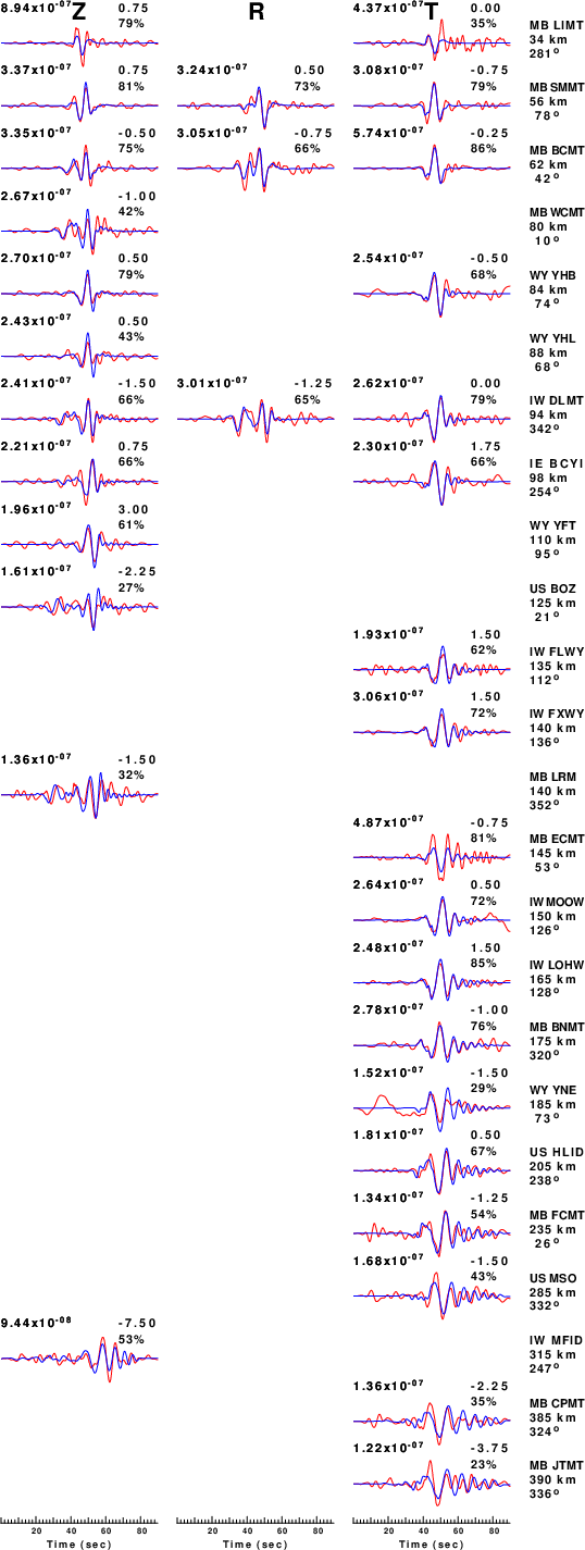 The comparison of the observed and predicted waveforms is given in the next figure. The red traces are the observed and the blue are the predicted. Each observed-predicted component is plotted to the same scale and peak amplitudes are indicated by the numbers to the left of each trace. A pair of numbers is given in black at the right of each predicted traces. The upper number it the time shift required for maximum correlation between the observed and predicted traces. This time shift is required because the synthetics are not computed at exactly the same distance as the observed, the velocity model used in the predictions may not be perfect and the epicentral parameters may be be off. A positive time shift indicates that the prediction is too fast and should be delayed to match the observed trace (shift to the right in this figure). A negative value indicates that the prediction is too slow. The lower number gives the percentage of variance reduction to characterize the individual goodness of fit (100% indicates a perfect fit).