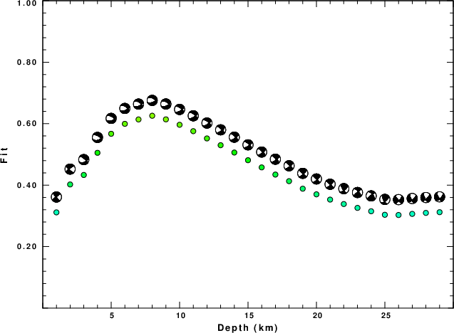 The program wvfgrd96 was used with good traces observed at short distance to determine the focal mechanism, depth and seismic moment. This technique requires a high quality signal and well determined velocity model for the Green's functions. To the extent that these are the quality data, this type of mechanism should be preferred over the radiation pattern technique which requires the separate step of defining the pressure and tension quadrants and the correct strike.