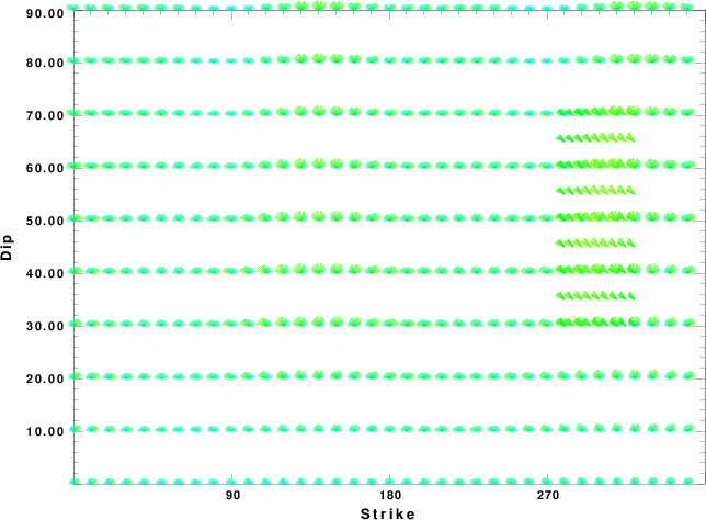 Focal mechanism sensitivity at the preferred depth. The red color indicates a very good fit to the waveforms. Each solution is plotted as a vector at a given value of strike and dip with the angle of the vector representing the rake angle, measured, with respect to the upward vertical (N) in the figure. |